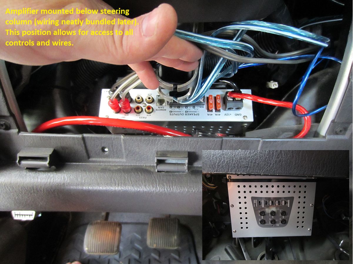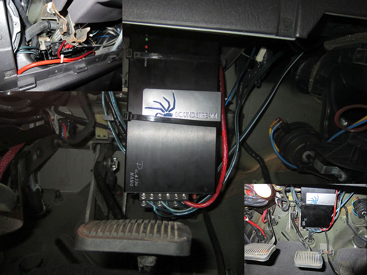 [AMPLIFIER UPDATE] Well, the Blaupunkt amplifier was old when we installed it and one channel finally went to amplifier heaven. This amp was replaced with a new SoundStream PN4.520D digital amplifier (manual HERE) from Sonic Electronix, same arrangement as before with front/rear wired in parallel for 2 ohm load and each sub at 2 ohm for 4 channels @ 130w each. To be honest, for a ~$100 digital amplifier that was this small, I had doubts about it being able to keep up with the old Blaupunkt but tech has come a way in the 10 years between amps and this amplifier ROCKS.....and does not get warm- we were pleasantly surprised and impressed. Cannot see in pics but wiring is all bundled and out of the way of all pedals/moving surfaces.