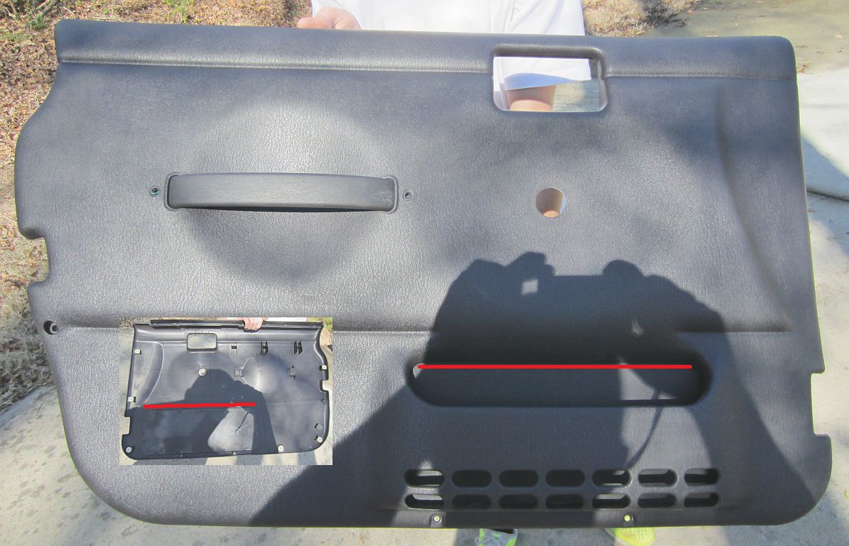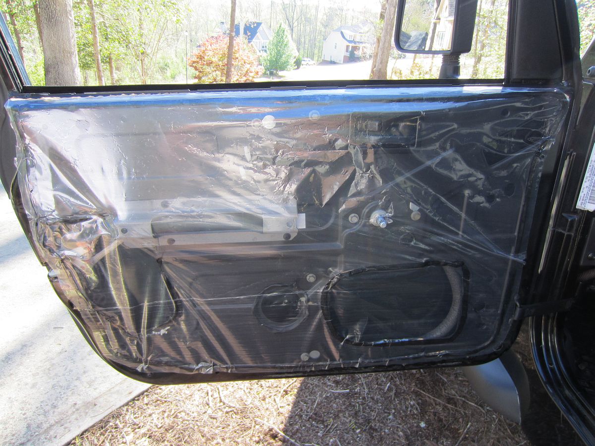 Found the cause of the water leak on the driver side. The water was coming in at the window and running down the inside of the door until it found the opening behind the door pocket and was running into the door pocket and then dripping on the carpet. Installed a vapor barrier to prevent this (pic was before we cut out the door handle hole and trimmed around the edges). It was evident someone had taken the door panel off, it was missing the clip-nuts for the door handle screws so they had rigged these placing all of the load on the plastic door panel instead of the metal door- this was fixed too. It seems the vapor barrier should have been there from the factory as shown HERE.