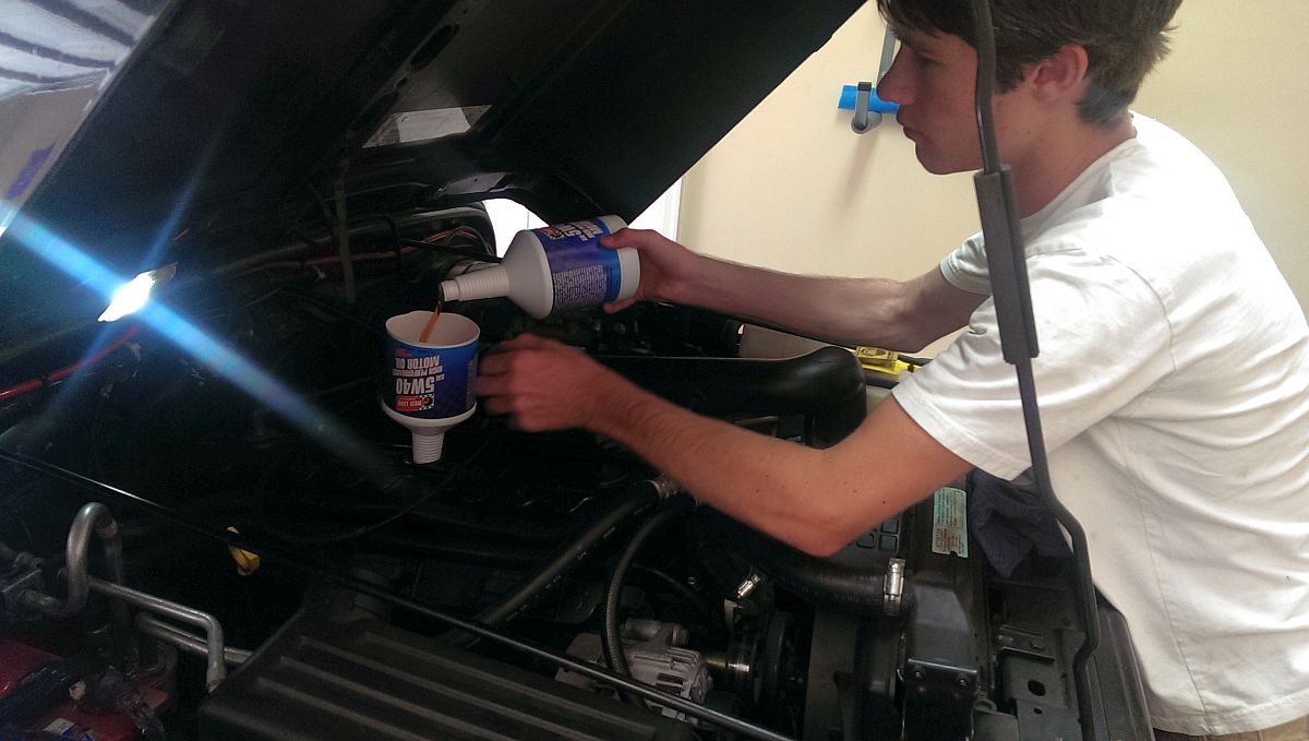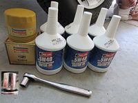 First oil change for us on this TJ, just 1-2k miles after we bought it. A friend was getting rid of some oil and as it turns out a lot of the 4.0 guys are using 5w40 instead of the 10w30- free Redline 5w40 synthetic oil will work for us. Purolator PureONE oil filter (PL14670) replaced the Mopar filter. Oil pan drain plug torqued to 25 ft/lbs after draining oil. And best of all, my son now knows how to change his own oil and most other fluids on the TJ.