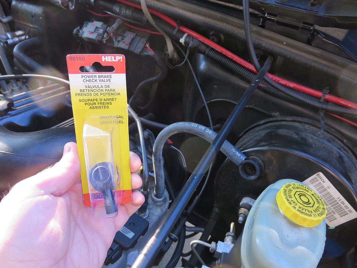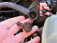 "Dad, the Jeep doesn't have any brakes, come pick me up" was the end to my night. It actually DID have brakes, just no power brakes and HARD to push the pedal so I drove it home. As it turns out the brake booster vacuum check valve had committed hari-kari and blown its guts all over the engine bay and road, leaving a non-working brake booster and a LARGE vacuum leak. You can see a small crack which probably contributed to this blowout. $5 later all fixed (the generic McParts part is a bit looser so if you have time, pick up the OEM part # 04584098).