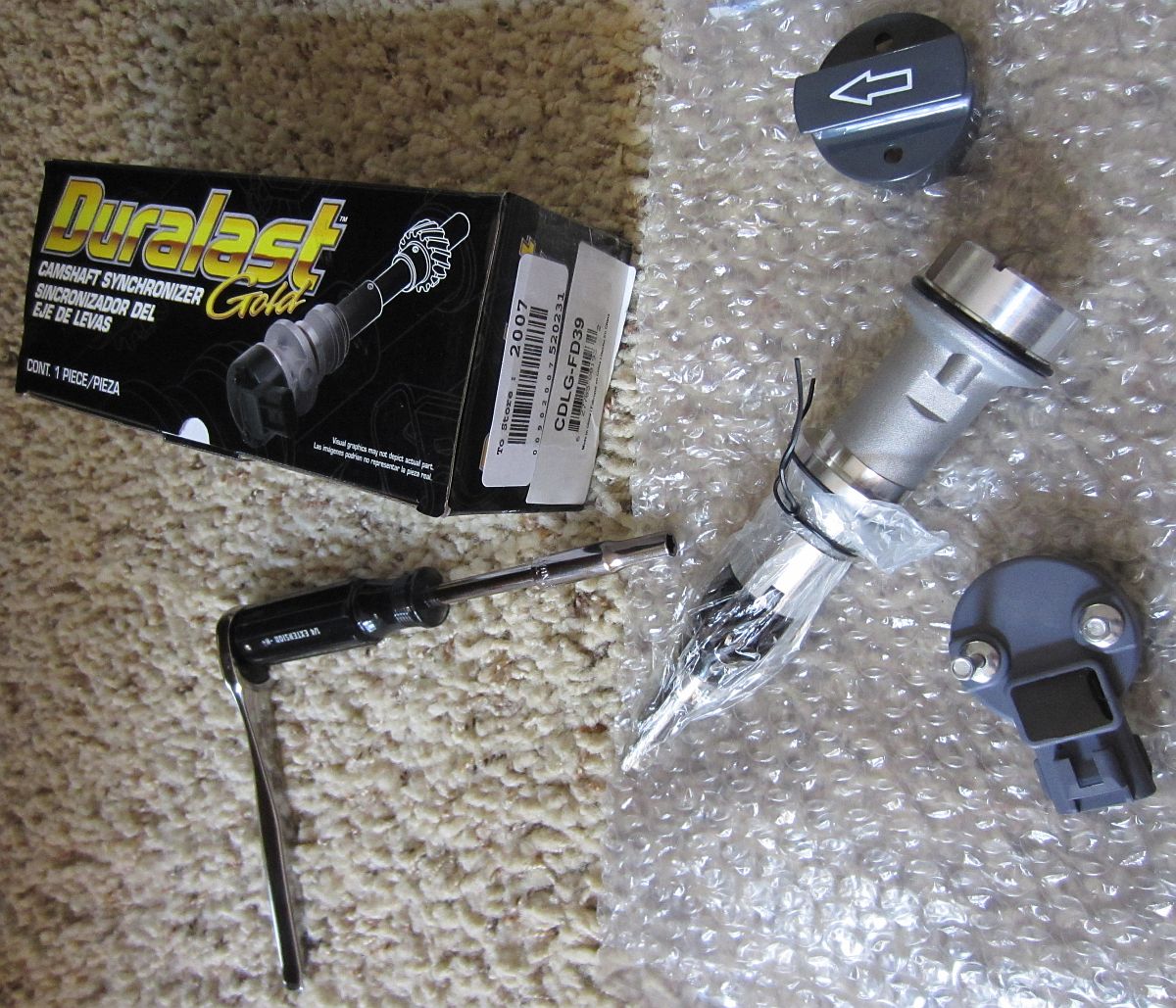 The Jeep's 4.0 had been tapping for a few weeks, I attributed it to a sticking lifter with the cold weather since the noise went away after the engine warmed up....but as it turned out this is also a symptom of a bad camshaft synchronizer. The Jeep threw a P0340 CEL code one morning when I was out of town, "Camshaft Position Sensor 'A' Circuit Malfunction". I was going to just order the camshaft position sensor but after reading a few forum threads decided for the little amount $$ more to just replace the entire camshaft synchronizer. I found one at AutoZone (Duralast P/N CDLG-FD39) with a lifetime warranty for ~$66 (archived page HERE). Perfect fit and sure enough, after this was installed no more tapping and no more code- AWESOME