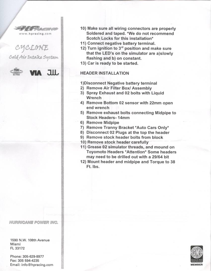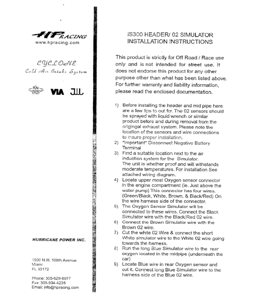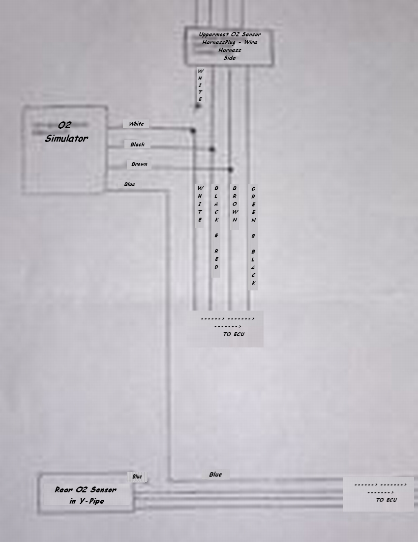 Below are the instructions for the O2 Sim install that came with my HP/Toyomoto header/midpipe. The signal wire on the O2 sensor side of the plug is blue and corresponds to the white wire on the harness side. These instructions specify that the white wire on the harness side should be used for the post-cat sensor on the front bank and that the blue wire on the sensor side should be used for the post-cat sensor on the midpipe. I did not feel good running the blue wire underneath the car to the rear sender with the heat from the exhaust and the chance of it getting pinched. SO, I elected to remove the passenger seat/trim and lift the carpet up to access the harness side white wire. The blue wire from the O2 sim can be run through the rubber grommet beside the battery and routed along the passenger side door trim. You have to tap into the harness side white wire close to the connector because it is shielded a few inches up the harness, you can see where the smaller wire is tucked into the shielding wire. For both the front and rear sender connections, I cut the blue wire on the sensor side and then carefully stripped the white wire on the harness side (NOT cut) and soldered the O2 sim wires wrapping carefully with electrical tape afterwards. You can use loom and wire ties or tape and it will look like it was there from the factory. Be careful NOT to splice into the shield or to get this wire and the signal wire crossed. You may also elect to do this at your own risk :-)
