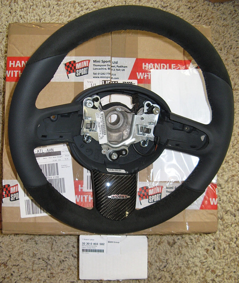 JCW Sports Steering Wheel purchased from UK vendor Mini Genuine Parts. I initially contacted Jayson at Classic Mini but he confirmed the US supply of JCW steering wheels was dried up. The exchange rate is not bad right now so it ended up being about the same price. I bought the leather and Alcantara version (P/N 32300403545) and was limited to the bottom center CF trim piece (P/N 32300403582) since I have the multi-function switches. The wheel is about the same diameter as the Sports package wheel I had, maybe a little thicker, and much better feeling materials covering the wheel. Swap takes about 30 minutes taking your time,