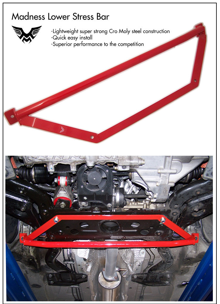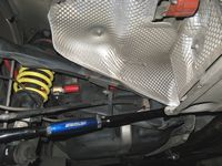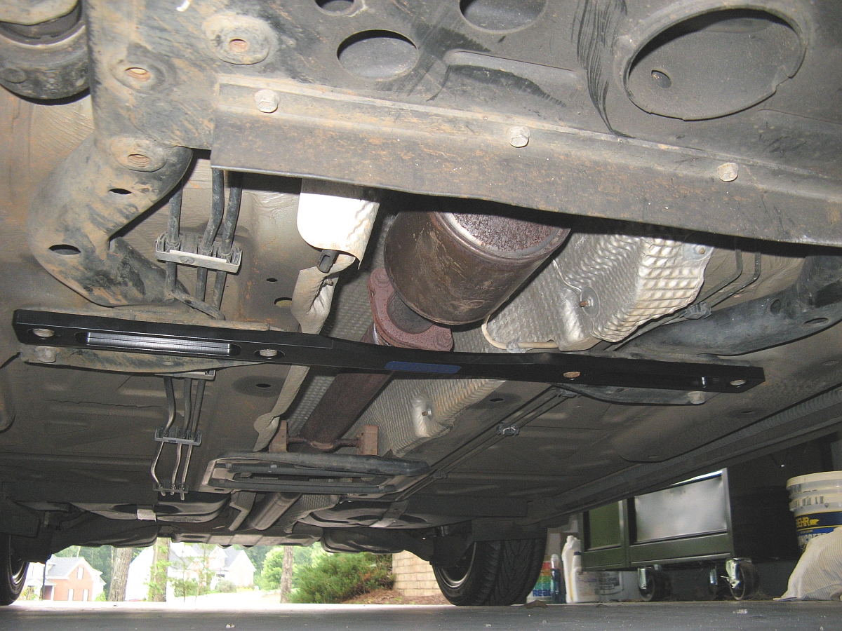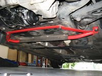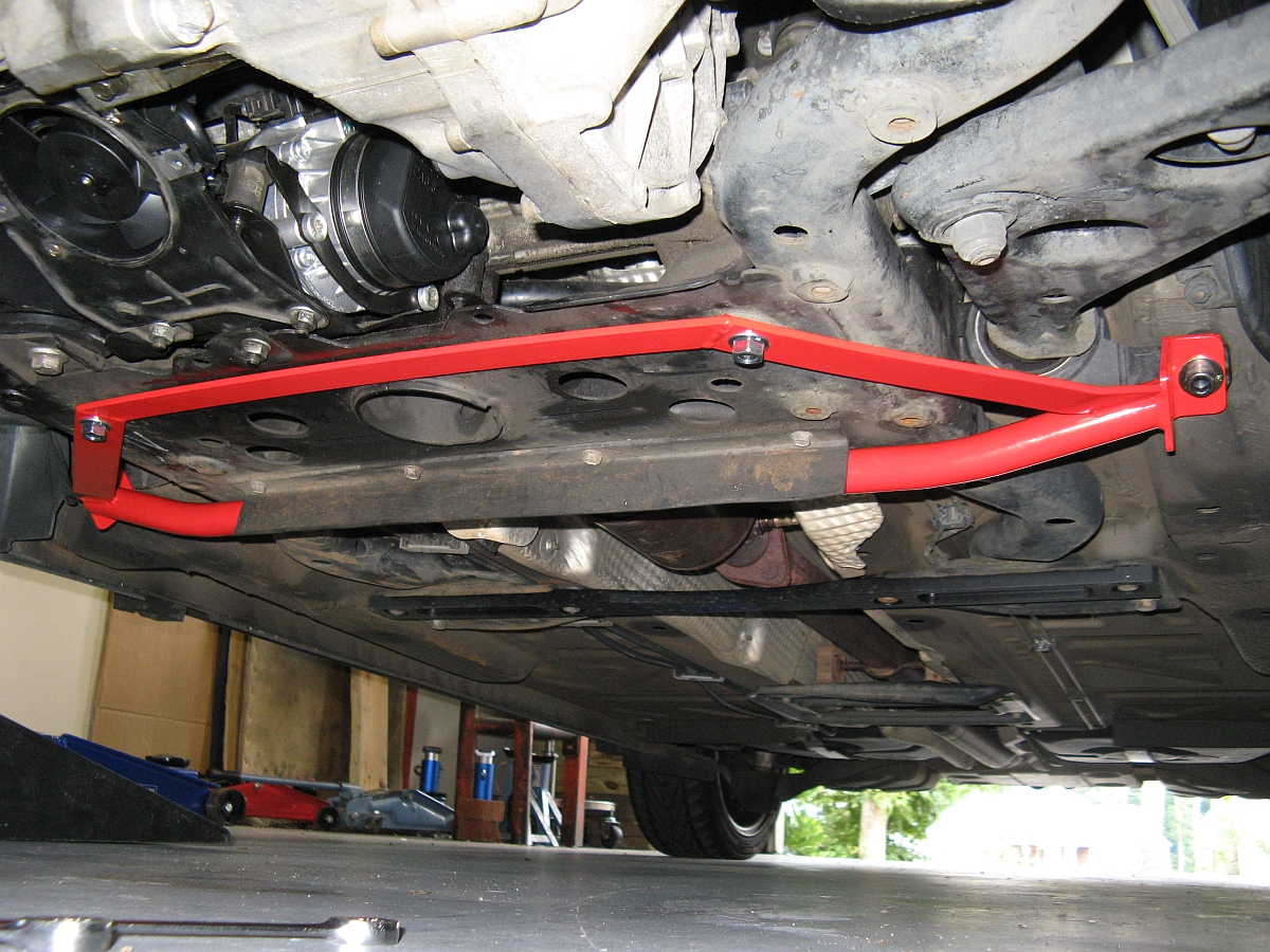 Lower mid brace from GT Tuning installed. Easy 10 minute installation: Drive car up ramps, remove 4 bolts with 16mm ratchet, install bar and reinstall bolts, torque to 74 ft/lbs- DONE. The brace strengthens the weak area where the front subframe bolts on either side of the exhaust tunnel, I can feel the car wanders/tramlines less and overall feels more solid.... to be honest, a lot more than I expected from this brace. I expect that when the MM subframe brace arrives it will improve even more.