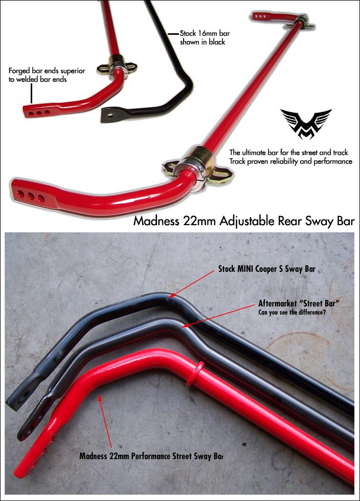 22mm forged solid adjustable rear sway bar from Mini-Madness installed, MM instructions HERE. Since I have used Hotchkis in the past with good results, I looked at the Hotchkis Competition hollow bar but found some issues on other forums where the hollow bars failed (see some examples HERE and HERE). After reading the Whiteline white paper HERE and giving it some more thought, I decided that the added weight was not an issue and that I preferred the stronger forged bar to the hollow bar and went with the MM bar.