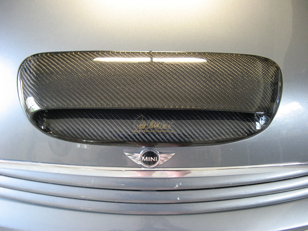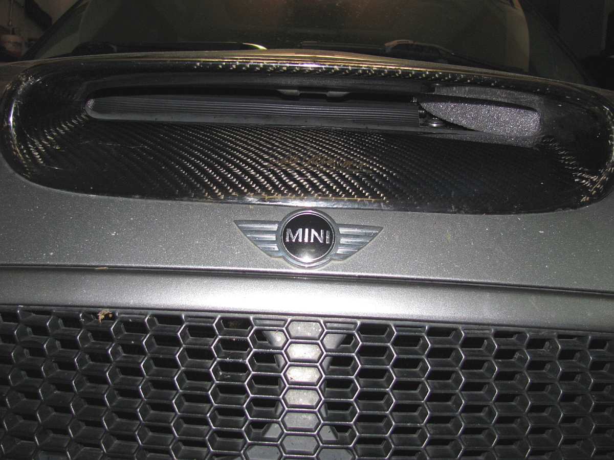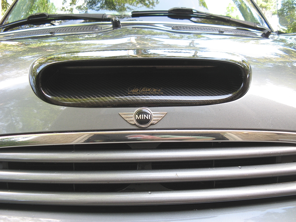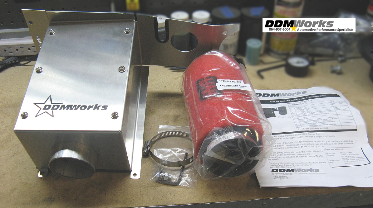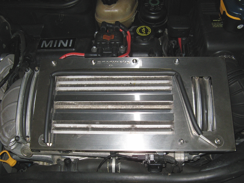 DDM Works R53 Cold Air Intake from EuroSport Design installed. This intake encloses the reusable UNI filter and is integrated with a new rear piece that replaces the OE piece- no cutting so return to stock is easy. The intake seems to offer a bit better acceleration and a lot more supercharger noise