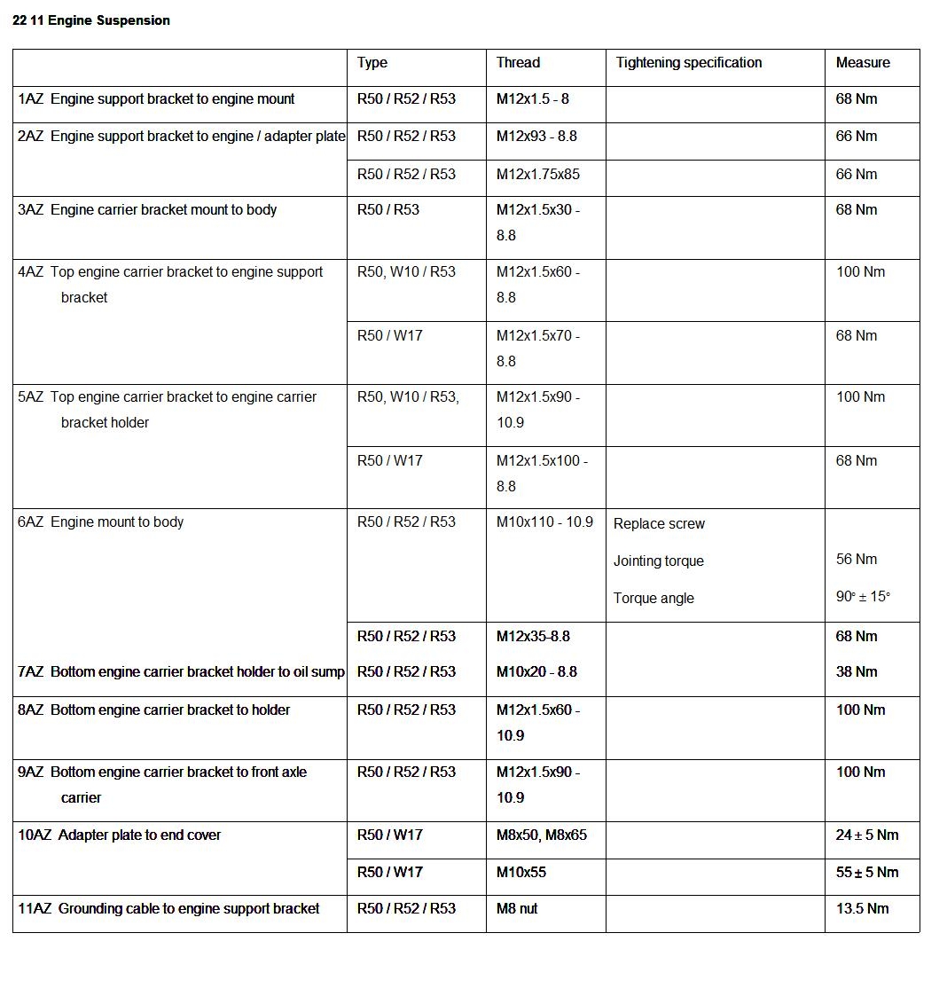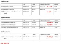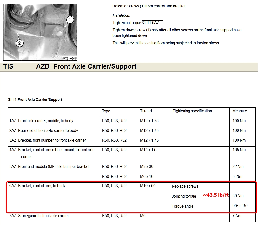I purchased the new brace from the NAM classifieds but since it came without hardware, I sourced that from MM. No instructions were included and I could not find any on the web but once you see where it goes it is fairly easy to see what needs to happen. After I had the car up on Rhino Ramps (parking brake on, rear wheels chocked), the control arm bushing bracket to body bolts on either side were removed using a 16mm socket/ratchet. These bolts are one time use, angle torque bolts (aka torque-to-yield bolts)- I have the TIS spec below, ~43.5 lb/ft and then 90 degrees additional rotation. I held the bar in place with one hand while installing the replacement hex head bolts with washers using a 7mm HEX socket/ratchet, these are installed loosely so the front bolt studs will line up and go in- If you cannot line them up and start them in the holes than the rear bolts are not loose enough to give you some play. The bolt studs have a 5mm HEX head used to install them/adjust them for fit with the nut, mine were able to hand thread in. I threaded these in so that they would be flush with the top of the nuts when tightened. After the studs are installed, the nuts can be installed hand tight. After using a torque wrench to tighten the rear mounting/control arm bushing mount bolts, a 13mm socket/ratchet was used to tighten the front bolts- no torque spec available so I just made sure they were subjectively tight (not gorilla tight). This brace should work well in concert with the other braces.