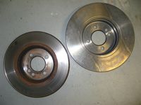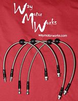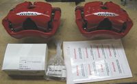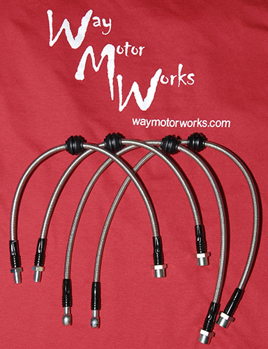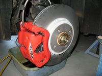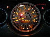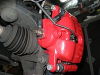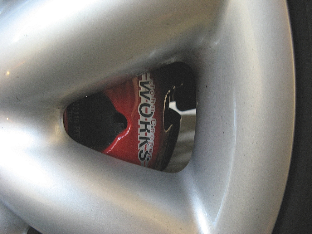 The JCW R53 brake system includes new larger front calipers/rotors/pads and rear pads for a matched system- original rotors are 276mmx22mm, new JCW rotors are 294mmx22mm. I also decided it was a good time to install stainless steel brake lines from Way Motor Works and flush the lines with ATE Typ 200 brake fluid. The brake bleeding was the worst part, usually the Motive pressure bleeder makes a full system bleed a half hour job, but it seems air snuck in somewhere so the Motive bleed was followed by the wife-manual-pump-and-hold-while-I-wrench bleed. I'll let you know after the prescribed 200 mile break in how these brakes areI will be painting the rear calipers to match soon.