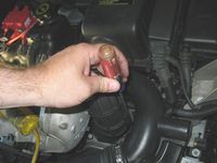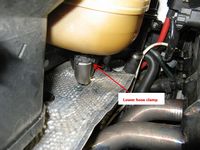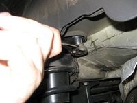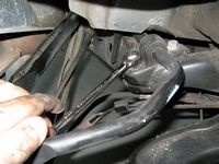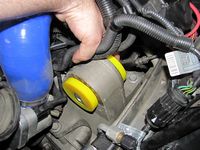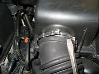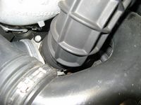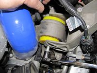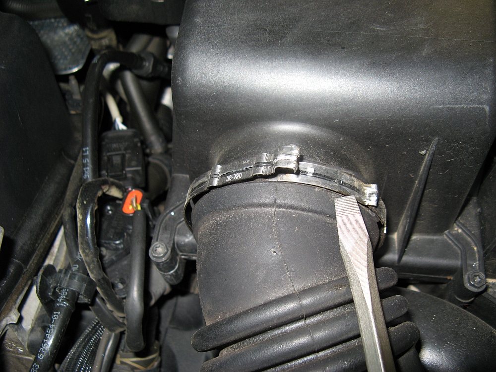 With the intercooler removed the intake hose is easily accessed. I used a flat blade screwdriver to pry apart the factory press clamps, just insert in the gap and twist. Once the top clamp was removed, the bottom was next. It may take a longer screwdriver to reach/remove this one. With both ends of the intake hose free, it is easy to flip the hose up and on its side to access the smaller hose clamp, removed with a pair of pliers. Installing the hose is easy to do in reverse order after the filter has been installed.