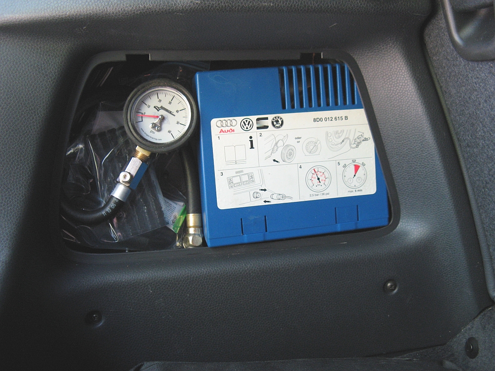Since the prior (and only other) owner had replaced the run-flat tires with better non run-flat tires, I opted to create my own mobility kit consisting of an old air pump and a tire plug kit stored in the driver side rear hatch compartment. In the other compartment, but not pictured, is a roll of duct tape and some screwdrivers/wrenches- covers fit back on both compartments fine and no rattles.