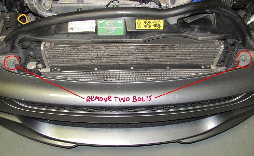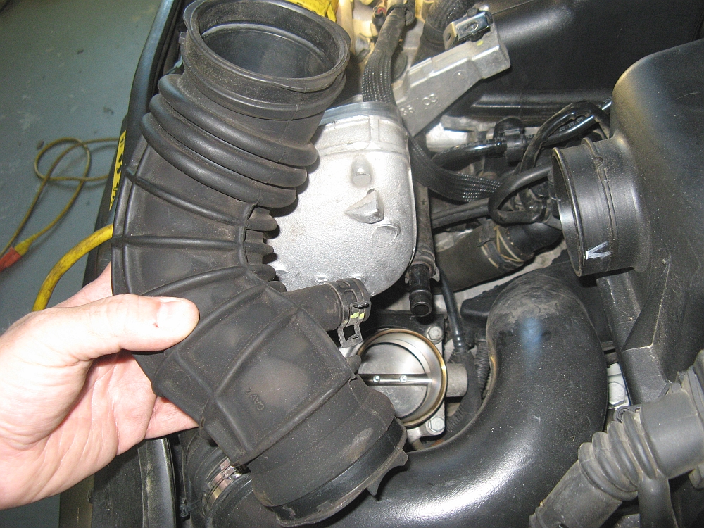 The intercooler frame/air diverter is removed (4 T30 Torx screws). The rubber bellows that hold the intercooler to the air horns are removed next, also 4 T30 Torx head screws for the bellows clamps. Once the clamps are removed the intercooler can be pulled out of the larger bellows and then the smaller bellows and removed.