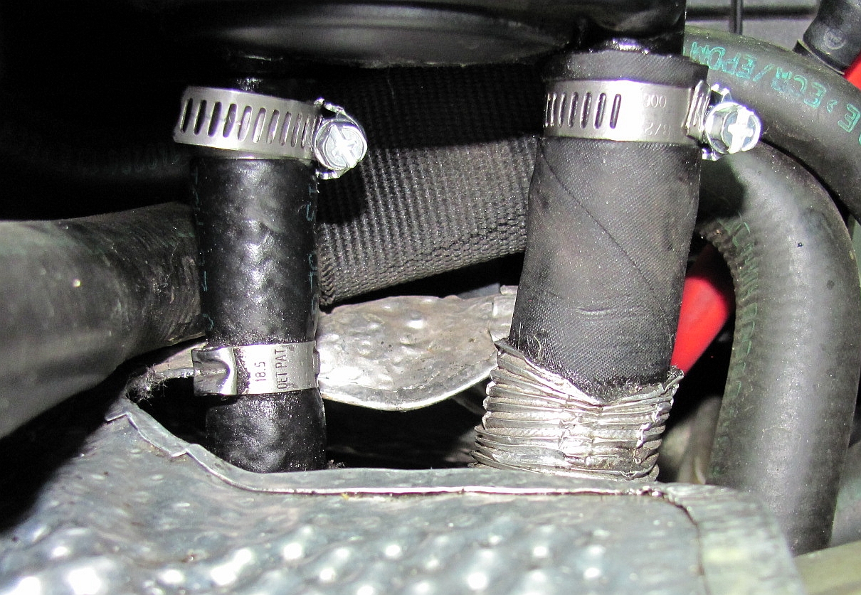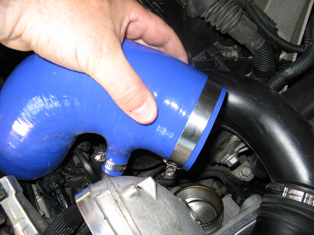 Once the new silicone intake hose and air filter are installed, the intercooler can be reinstalled with the new silicone couplers. I tried this a few different ways and found the best was to seat the smaller side of the intercooler FIRST and then the larger side LAST. When installing the clamps, be sure they are tight, if they are loose or leaking they can be made tighter by removing some material with a small file on both the male and female opposing sides of the clamp- I did not have to do this with mine as they were tight.