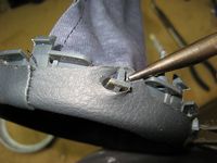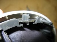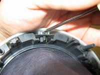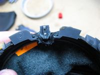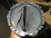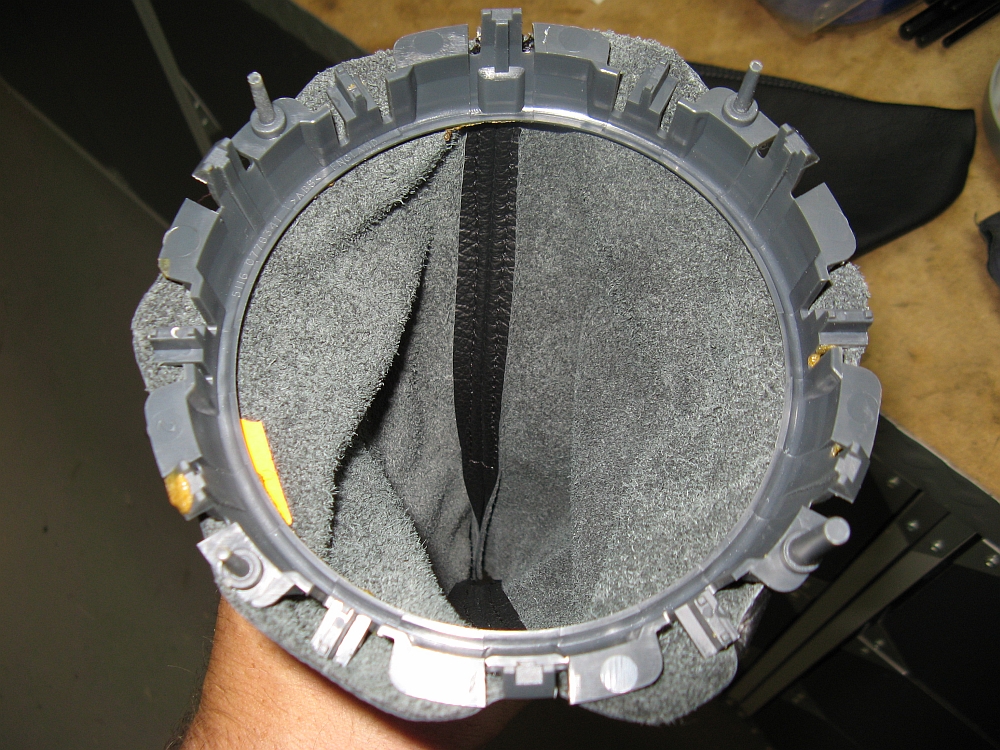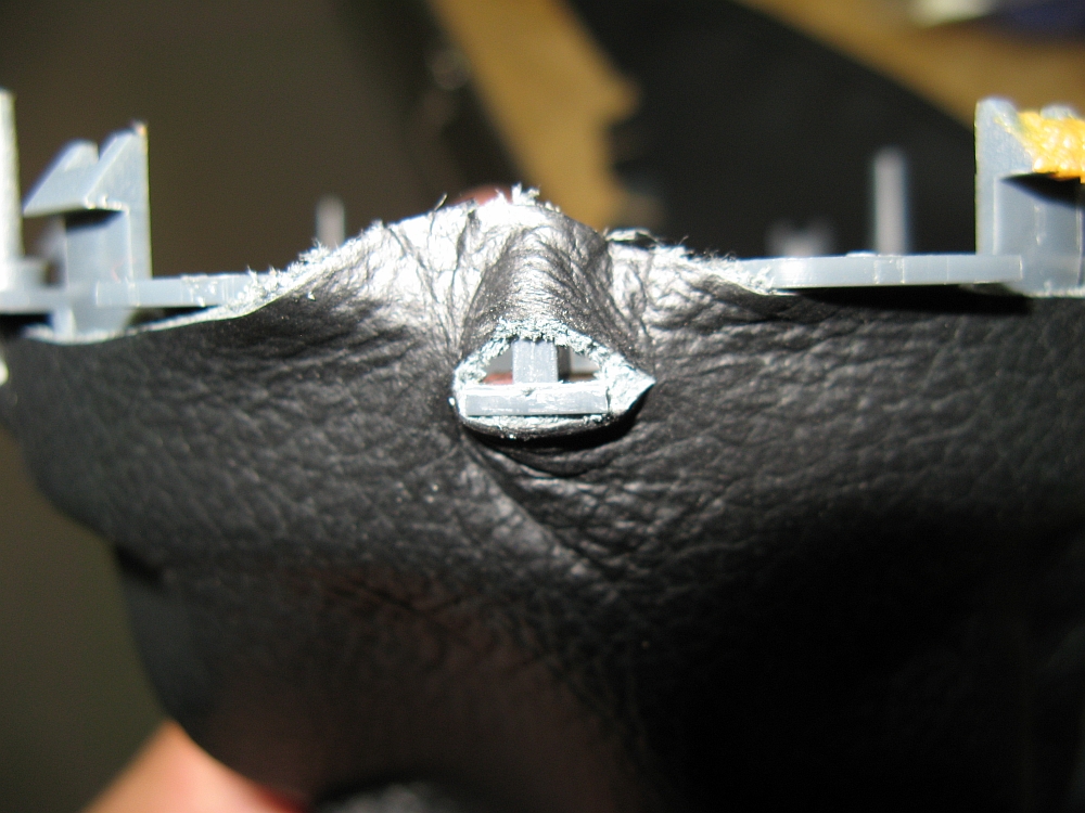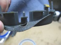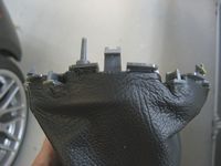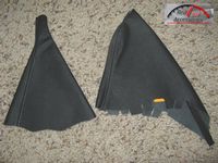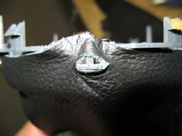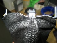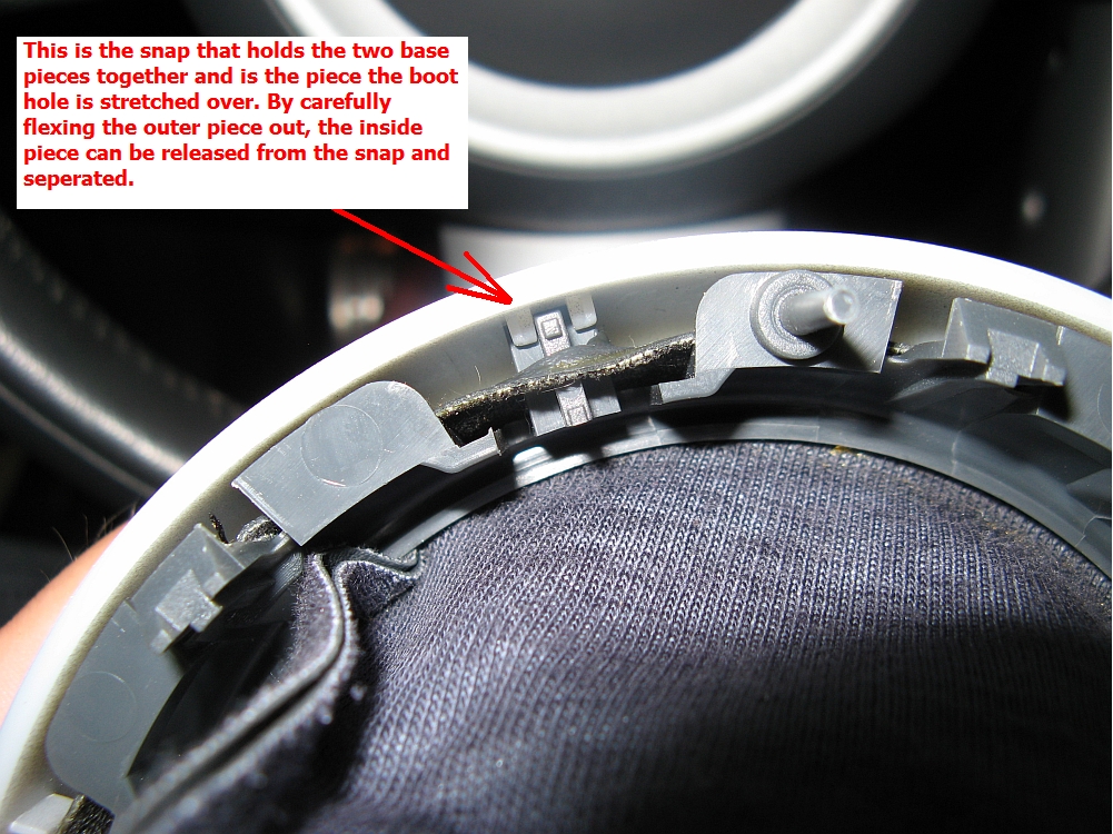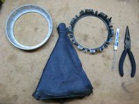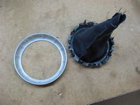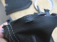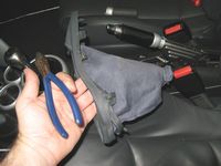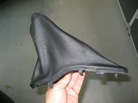 The shifter boot is attached to the base which snaps into the center console, a zip tie hold it to the shifter. This piece has four locator pins so it is important to line these up when snapping it back in. The boot is held to the base by having points around the boot stretched over retaining clips in between two pieces of the base and somewhat glued. The zip tie is cut off and the boot and shifter base are removed. The base pieces can be carefully seperated by pushing the outer ring (or using a flat blade screwdriver) to allow the inner piece to seperate, the shift boot can then be removed (I used needle nose pliers). Note the orientation of the boot on the base prior to removing and make reference front/back marks marks if needed- you don't want the new boot attached to find it is not the way you want it. The new boot will have to have holes cut in it to attach to the base, this can be done with a new sharp razor blade or Xacto knife using the old boot for reference. I used quick-dry SuperGlue to attach the boot to the inner ring in between mouting holes, it has been my glue of choice in the past. Once the boot has been attached to the inner ring, the outer ring can be carefully snapped back on. The boot is turned inside out and a new zip tie is used to secure it to the shifter. The base is then carefully snapped back into the center console.