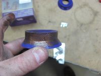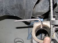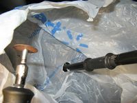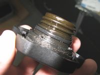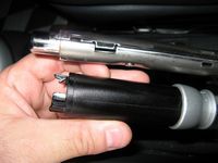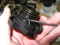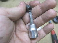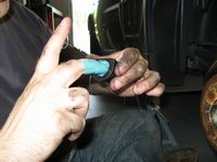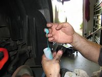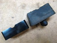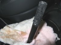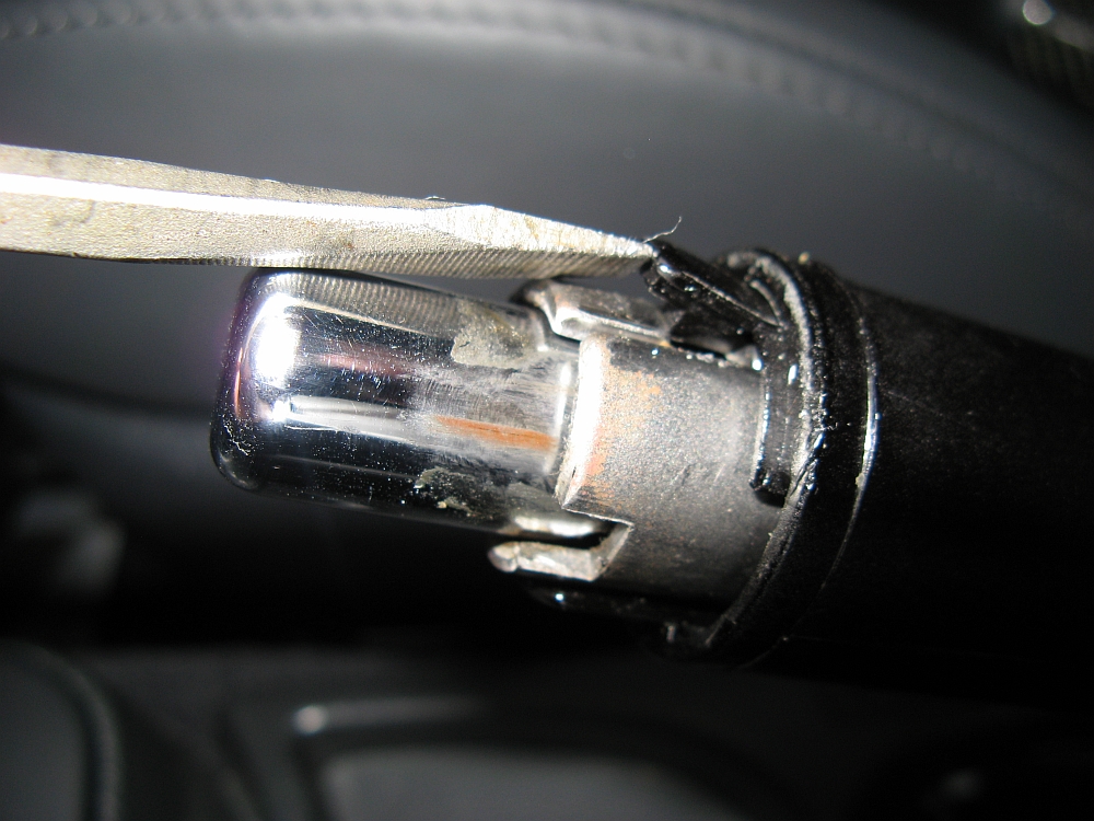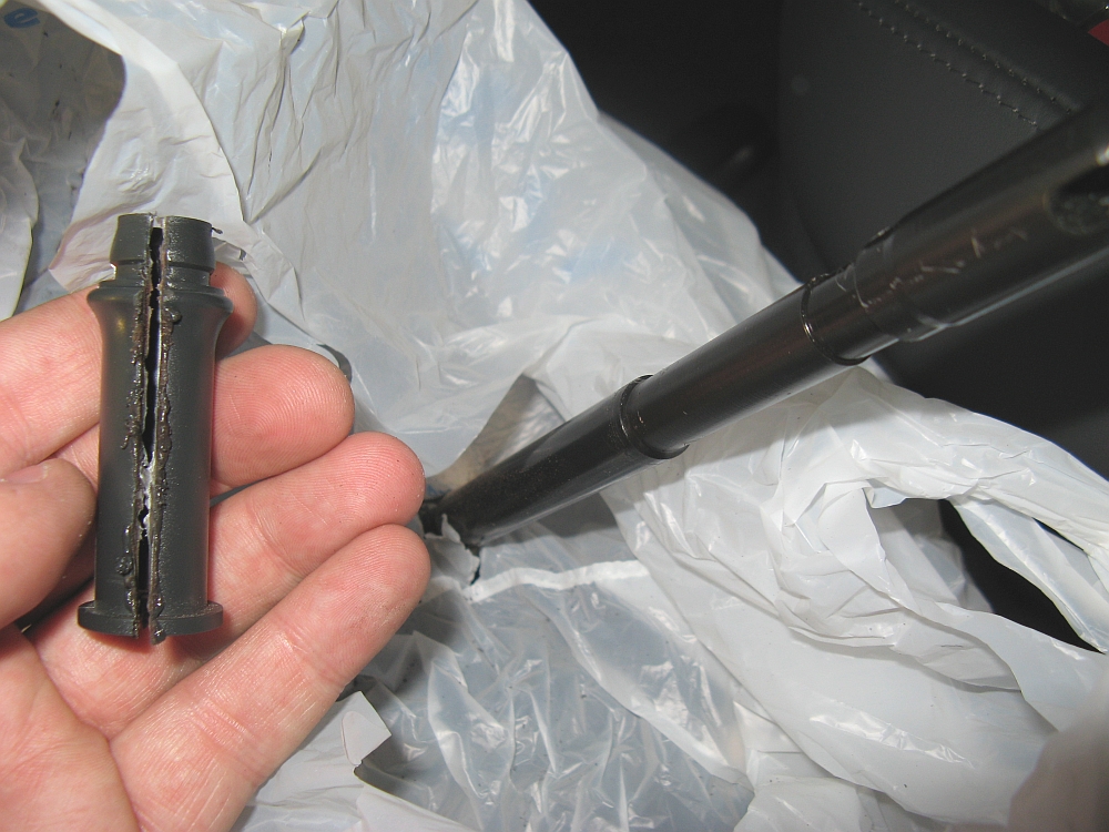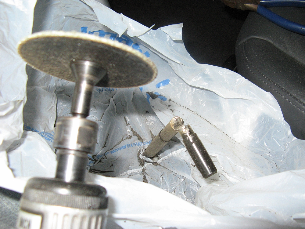 The OE knob is removed with some upward force, I usually put the shifter into 4th gear and pull up/back- be careful not to hit yourself in the face/head with the knobYou will now be able to see a plastic piece that resides in a channel on the metal shifter, this is the OE knob retainer and some space that allows for the shift boot to slide up and down. The only way to remove this piece is to cut it off- I used a Dremel with a cutoff disc. I made a cut down the front and was able to remove the piece intact, it might be possible to relocate the piece to work with an OE or Whalen knob that needs it. I cut off ~1.75" of the metal stick using a die grinder and cutoff wheel, I used a plastic grocery bag to catch most of the metal dust but in retrospect should have used tape at the bottom to tightly seal the bag to the shifter rod and reduce the celanup from the metal dust that got through the small area around the hole. Once the piece was cutoff, I used a metal file to smooth the edges and then removed the bag of plastic/metal shavings. since the UUC knob was sized for the larger part of the shifter and not the recessed part where the plastic piece used to be, I used some cloth tape to make the UUC bushing inside the shifter tightly fit on the shifter.