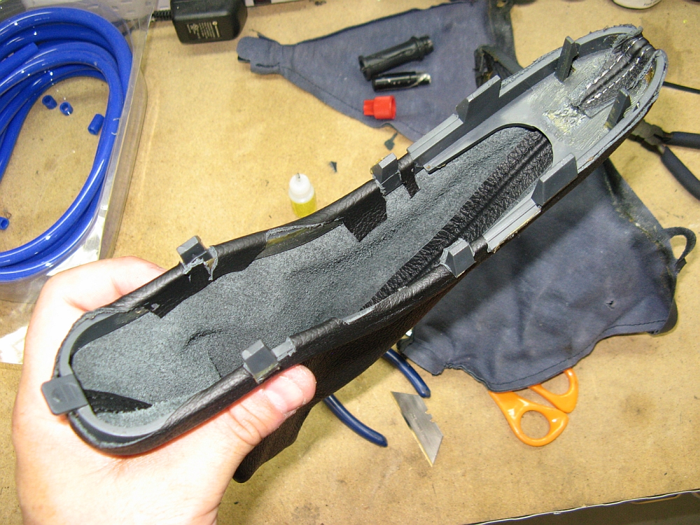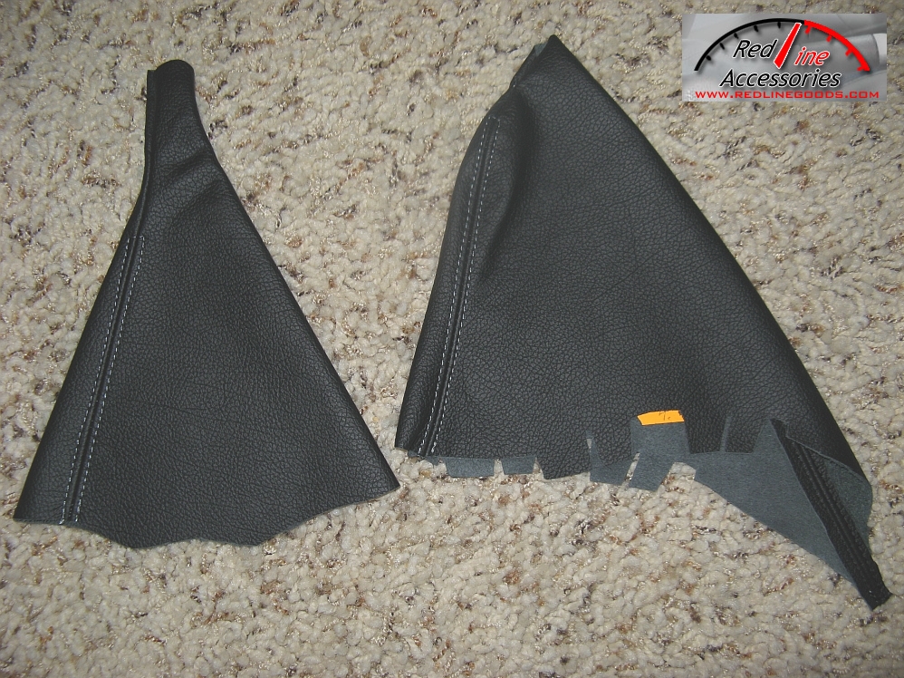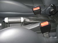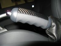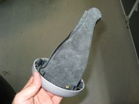 The process with the new parking brake boot installation is similar. The handle will have to be removed- using a small screwdriver to help the trim ring at the front of the handle can be snapped off (careful not to damage the plastic) and the handle can then be pulled off. To remove the boot, pinch the boot at the back and pull up to unsnap at the rear. Working your way to the front, there are retainers on either side that you will need to push down/in and then pull up as they release. These side retainers are easy to break so go slow. The front is then unhooked after cutting the zip tie that holds the boot to the handle and the boot can be removed. As with the shift boot, the new boot will require some cutting to work with the base, I lined up and glued the front and rear and worked around the sides from there trimming and gluing. Once the new boot is attached, it can be turned inside out and reattached using a zip tie and then slipped in at the front and snapped down on the sides and back. The handle is reinstalled and the silver piece that retains the handle snapped on.