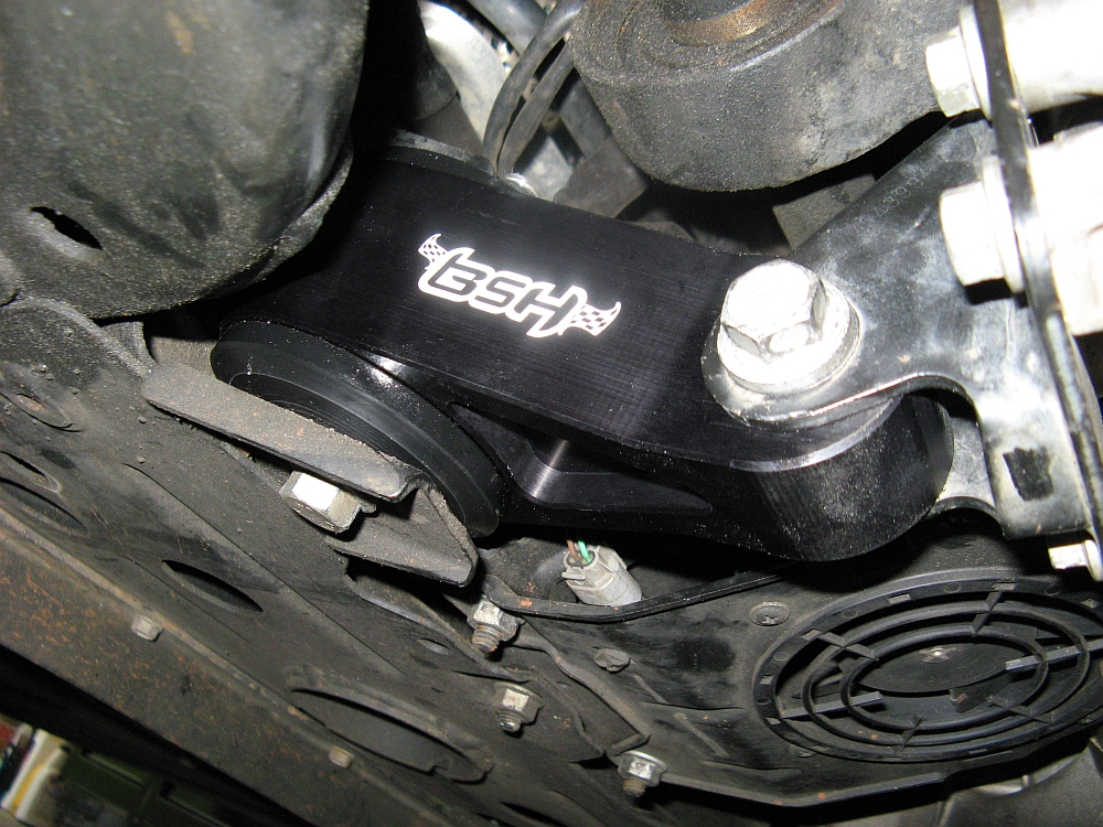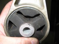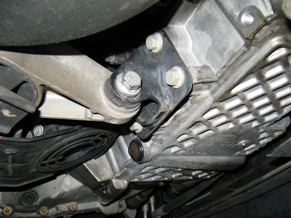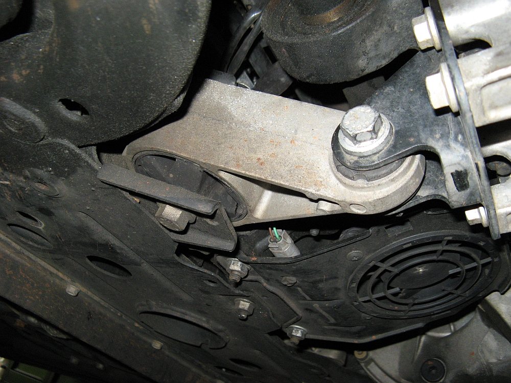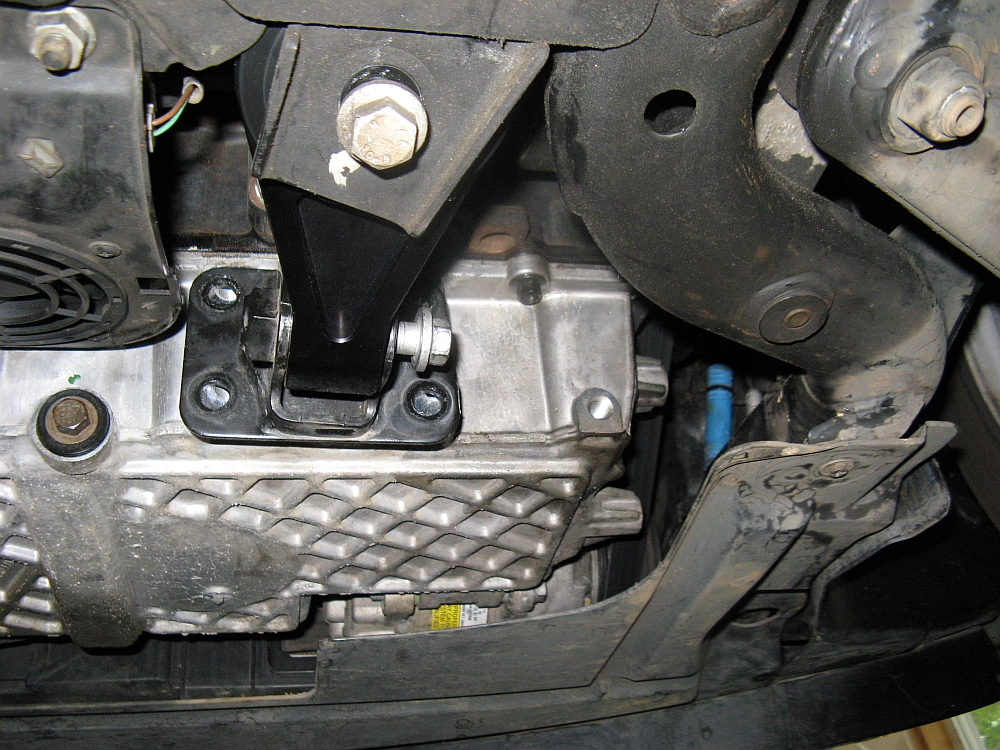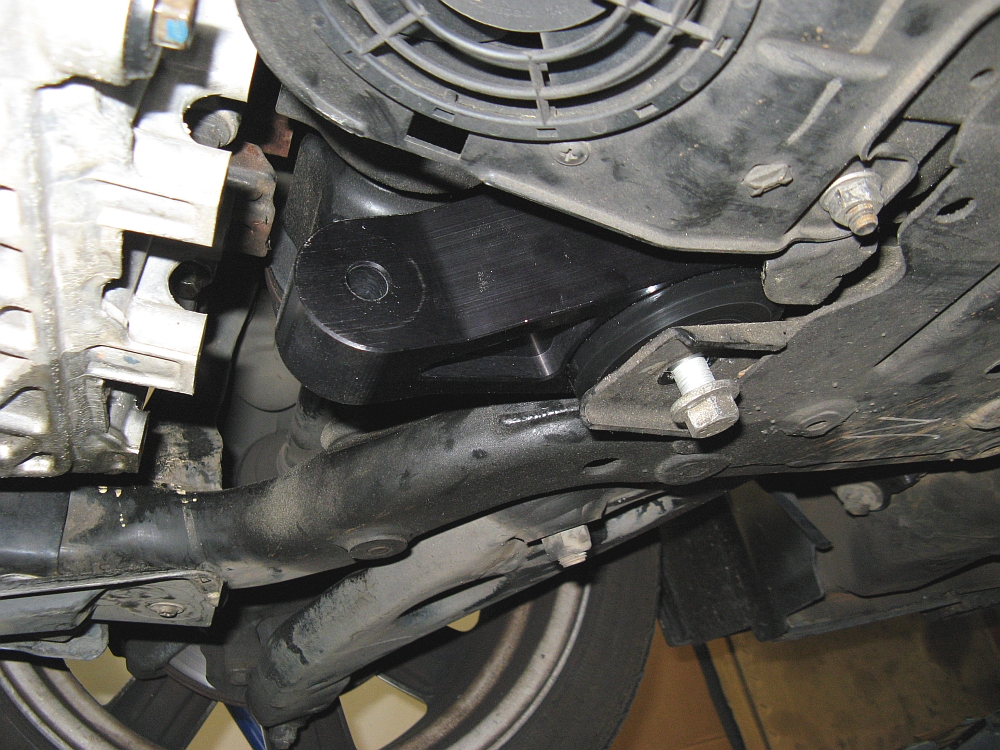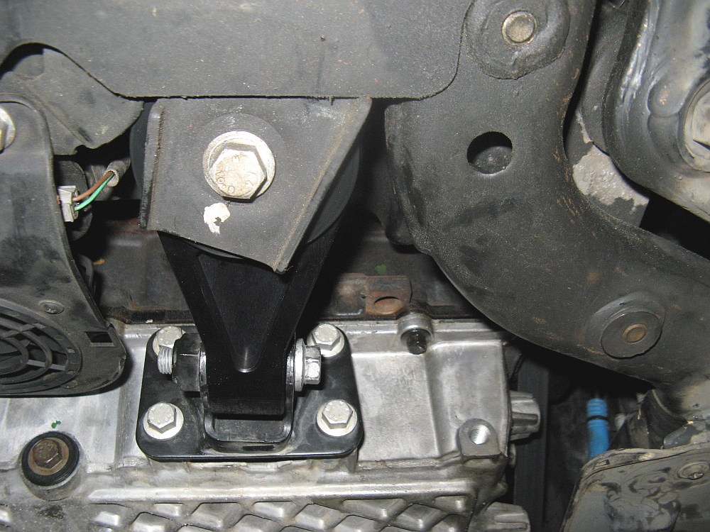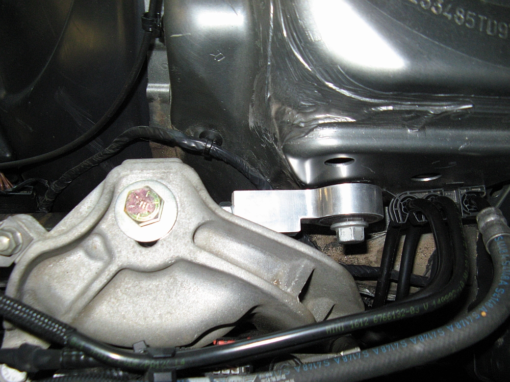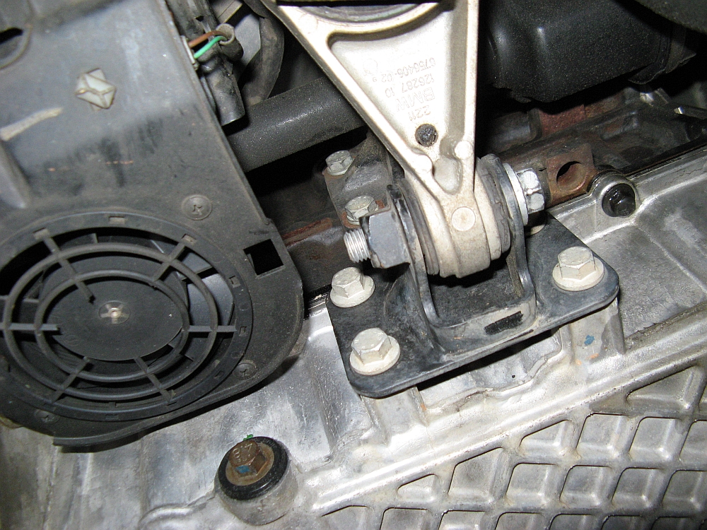 The lower mount is removed using a 16mm wrench on the larger bolts (2) that hold the mount in, and a 13mm wrench on the trans bracket bolts (4). I drove the car up on Rhino ramps before the R&R. The mount can be removed without removing the trans bracket but it is a bit harder to install the less compliant BSH mount- go ahead and make it easy, remove the four trans bracket bolts and bracket along with the mount. Installation starts by loosely starting the mount/firewall bracket bolt, then the mount/trans bracket bolt, and then the four small bolts that hold the trans bracket to the transmission. Starting the bolts may require moving the motor with one hand while starting with the other, it should be fairly easy to swing to the front or back. Once all are started they can be torqued to spec, starting with the (4) trans bracket bolts.