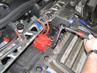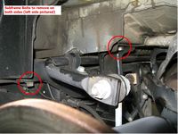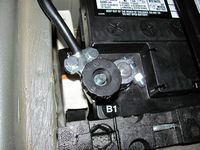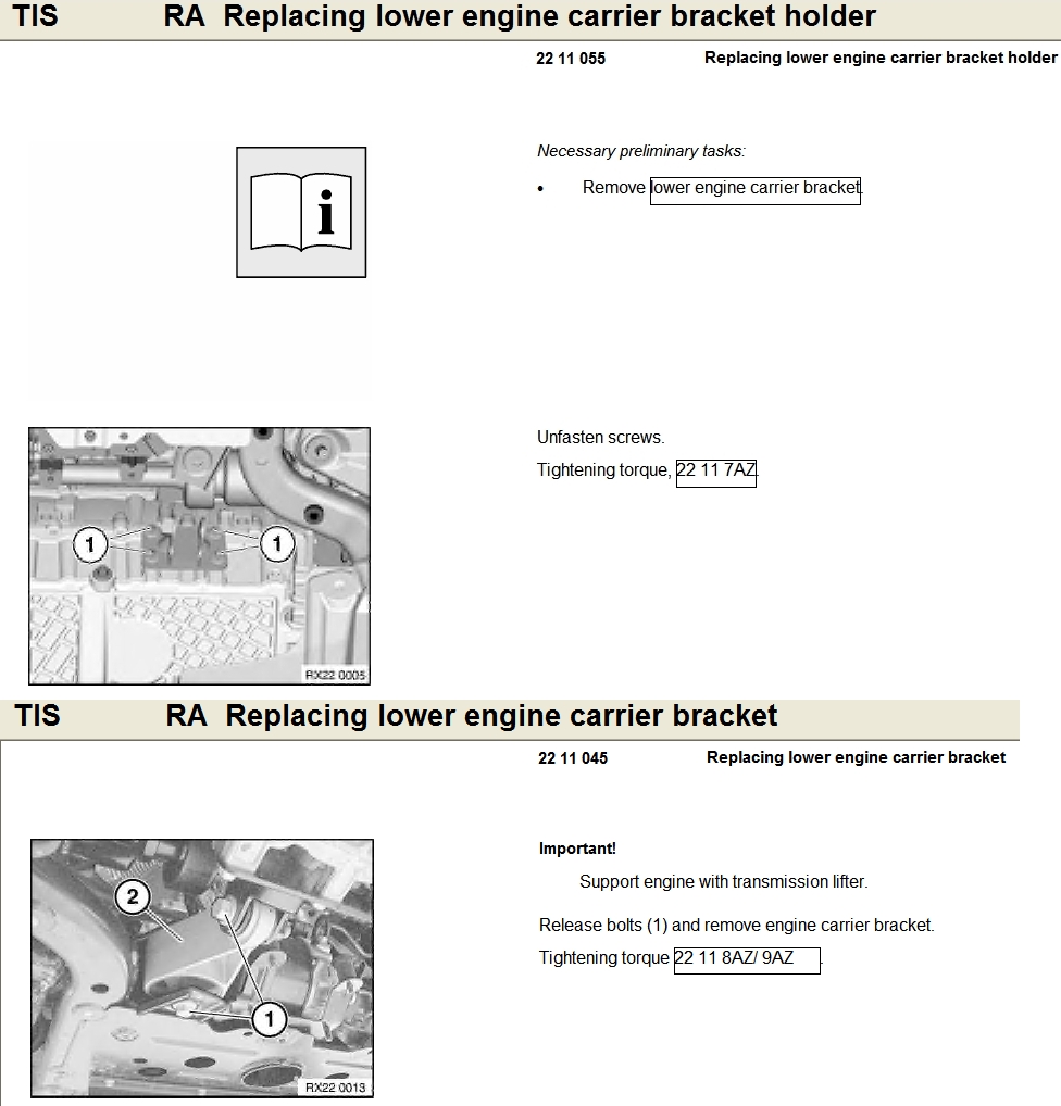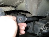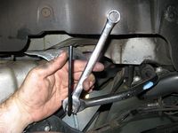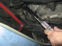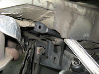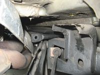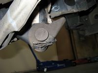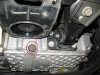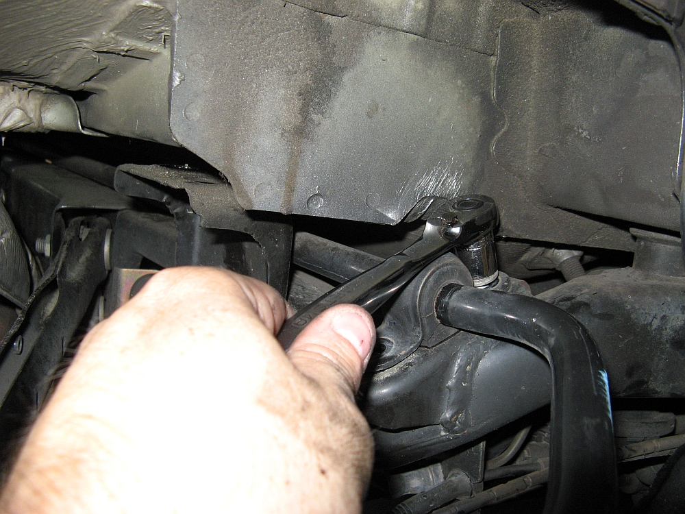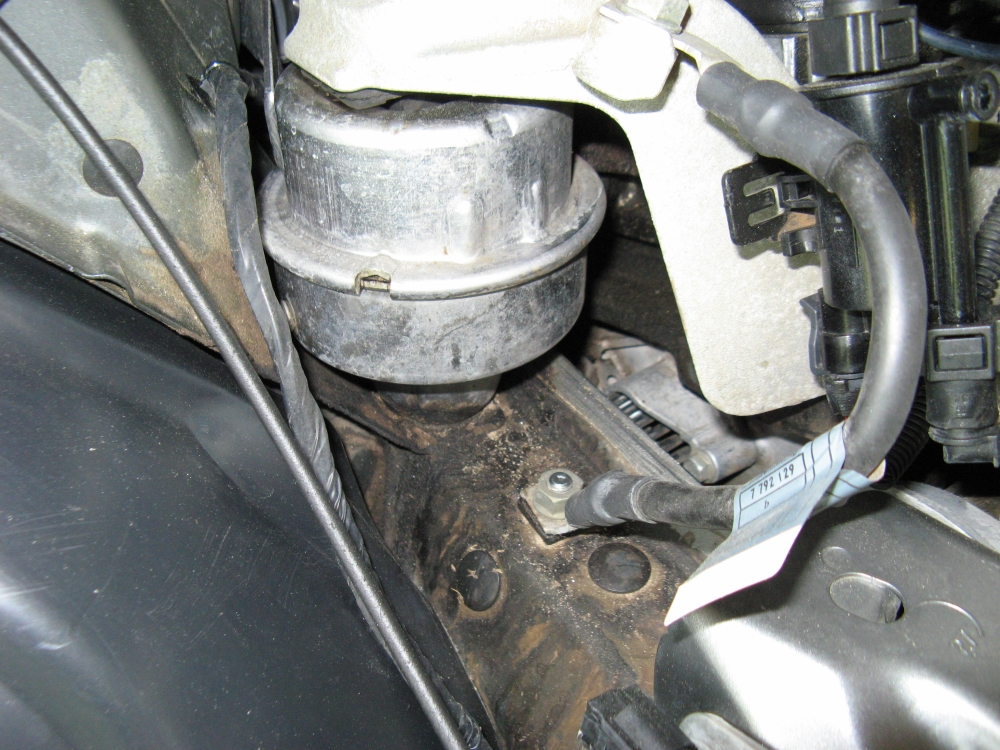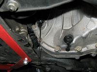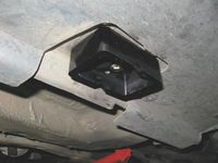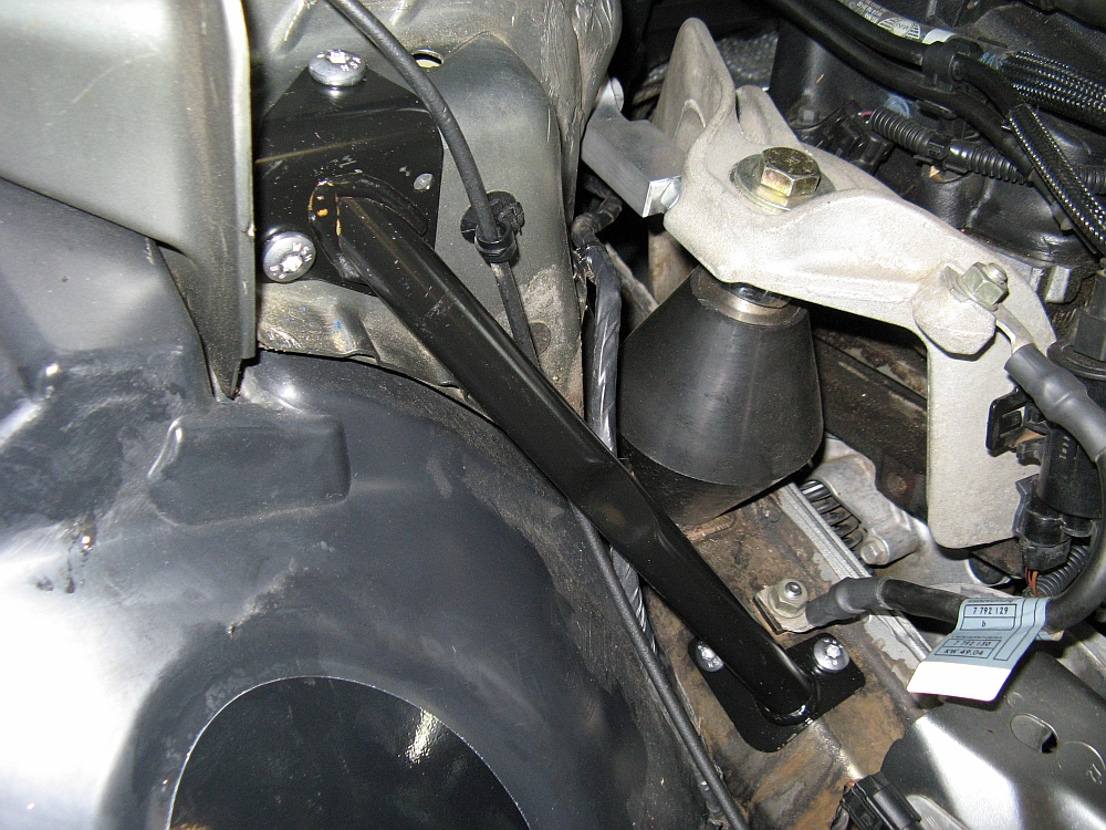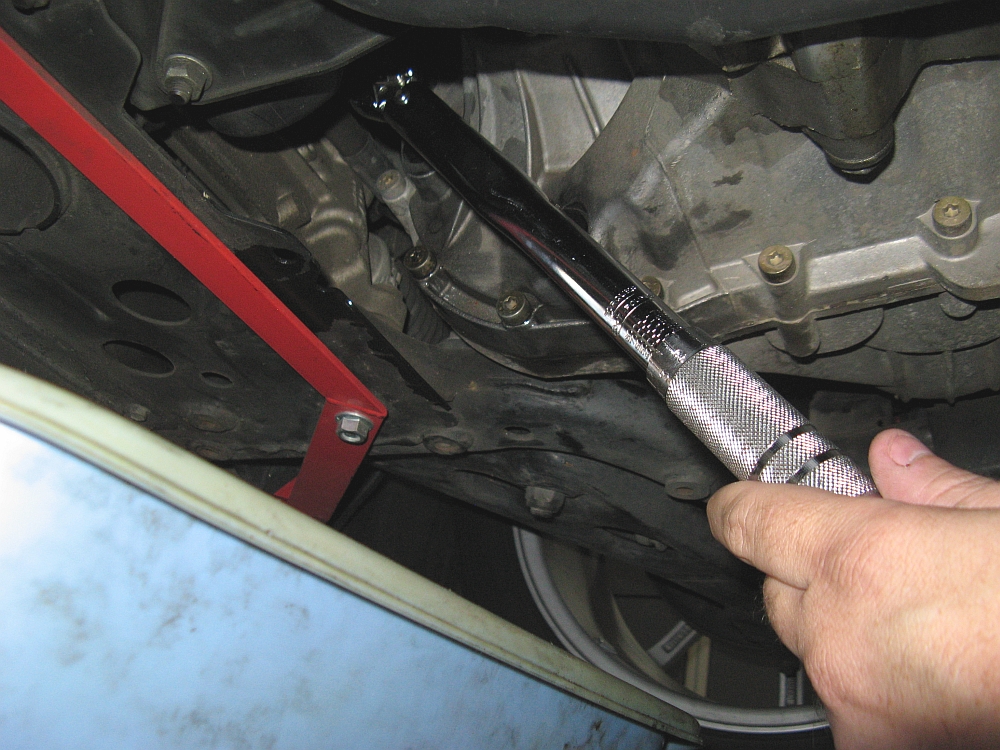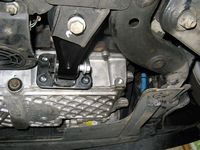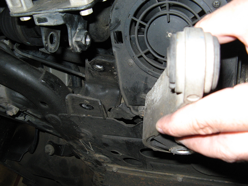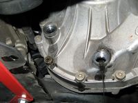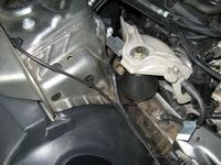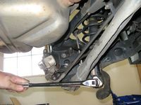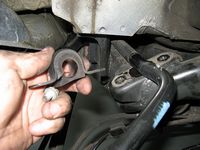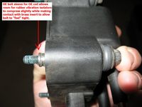 The lower mount is removed using a 16mm wrench on the larger bolts (2) that hold the mount in, and a 13mm wrench on the trans bracket bolts (4). I drove the car up on Rhino ramps before the R&R. The mount can be removed without removing the trans bracket but it is a bit harder to install the less compliant BSH mount- go ahead and make it easy, remove the four trans bracket bolts and bracket along with the mount. Installation starts by loosely starting the mount/firewall bracket bolt, then the mount/trans bracket bolt, and then the four small bolts that hold the trans bracket to the transmission. Starting the bolts may require moving the motor with one hand while starting with the other, it should be fairly easy to swing to the front or back. Once all are started they can be torqued to spec, starting with the (4) trans bracket bolts.