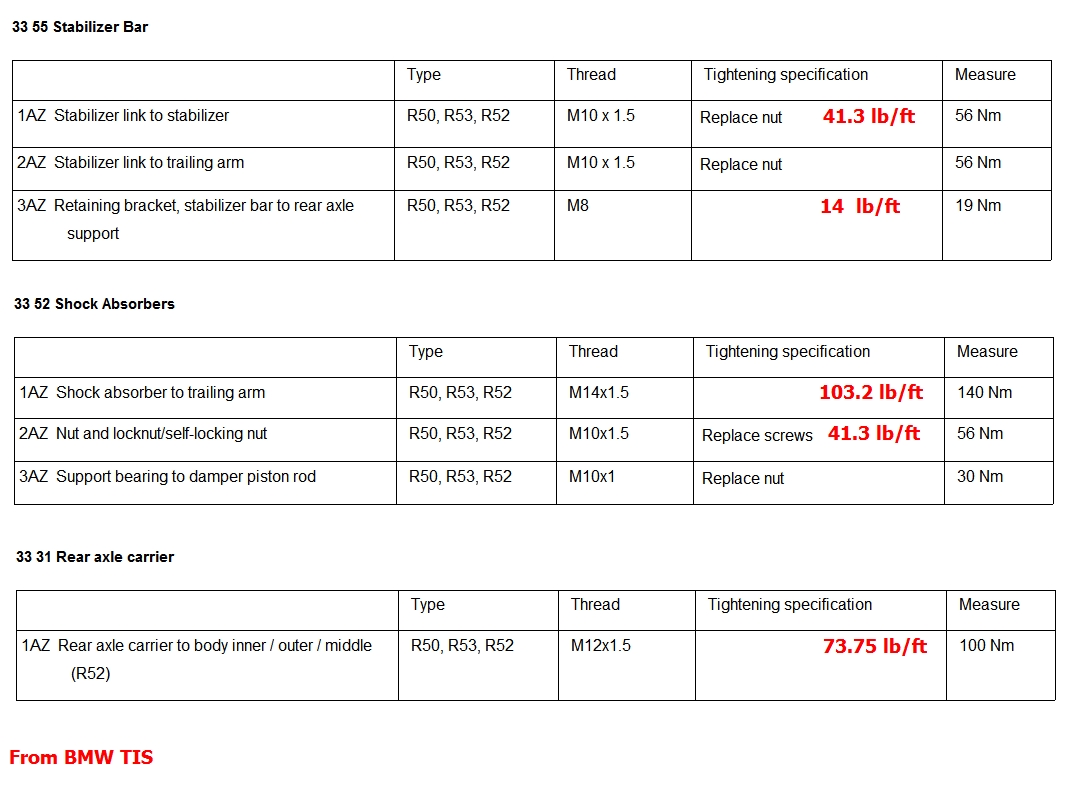 The basic steps are the same, I have included the TIS torque specs with converted lb/ft numbers that you can verify HERE: the car is raised and placed on jack stands, the rear wheels are removed, the brake lines and wiring are removed from the rear shocks, the lower shock bolts are removed, the upper shock bolts are removed, the sway bar endlink bolts are removed, the swaybar bushing bracket bolts are removed, the four subframe bolts are removed, a pry-bar is used to push the subframe down to allow clearance for the sway bar to be pushed from the right side to the left side where the old bar is pulled out (careful around the battery wire in the center for S models), installation is reverse of removal with some grease on the new bushings and paying attention to torque specs.