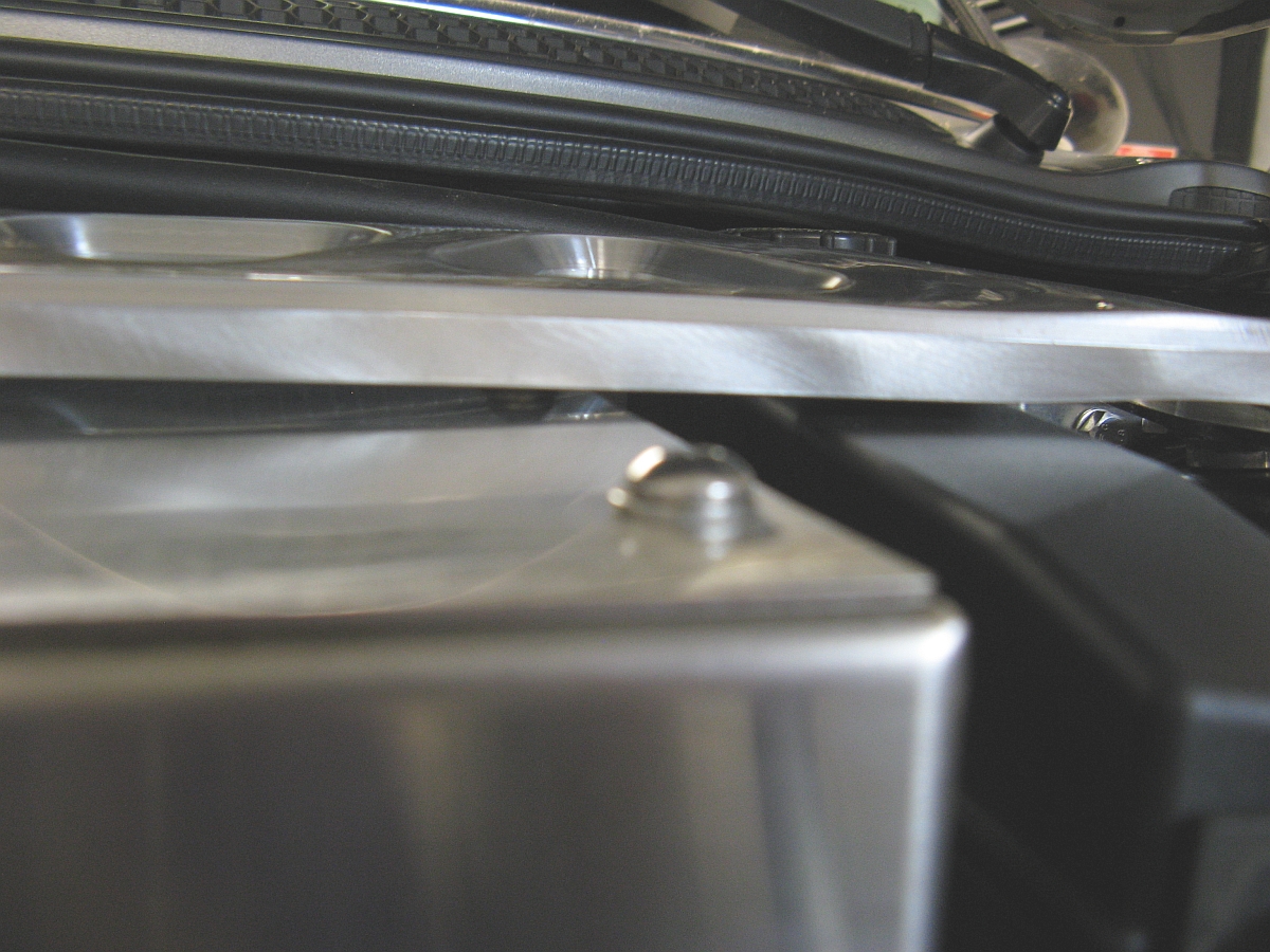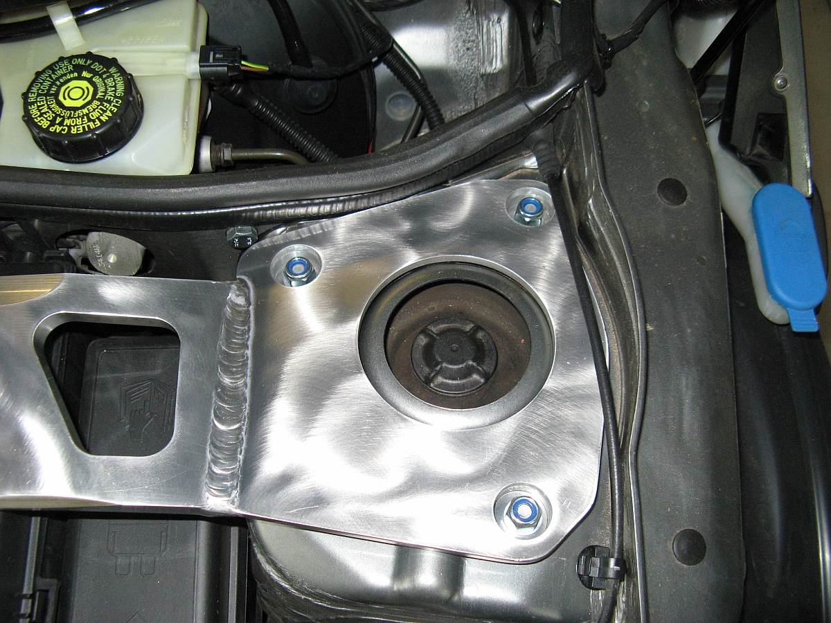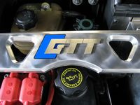 This brace is almost too nice to install on the car and I briefly thought about hanging it on the garage wall. Easy installation- make sure car is on ground with wheels loaded, remove three bolts per side from the strut towers (six total) using a 13mm socket/ratchet, place brace in place being careful not to pinch the hood release cables, install new Nylock bolts and washers provided, tighten to 25 lbs/ft. As noted in the GTT instructions, the brace is designed to not interfere with the hood closing (a problem that other bars have) and is designed to make contact with the airbox to allow for that. The DDMW airbox I have installed would have cleared but one of the bolts for the lid was in a place that lines it up with the bar so it is just touching, no rattling or worries though and the hood closes perfectly with no interference. There is a notch cutout for access to the oil filler cap, I have put oil in since installation and can say it works well enough. This bar is SOLID and the car feels more solid post install.