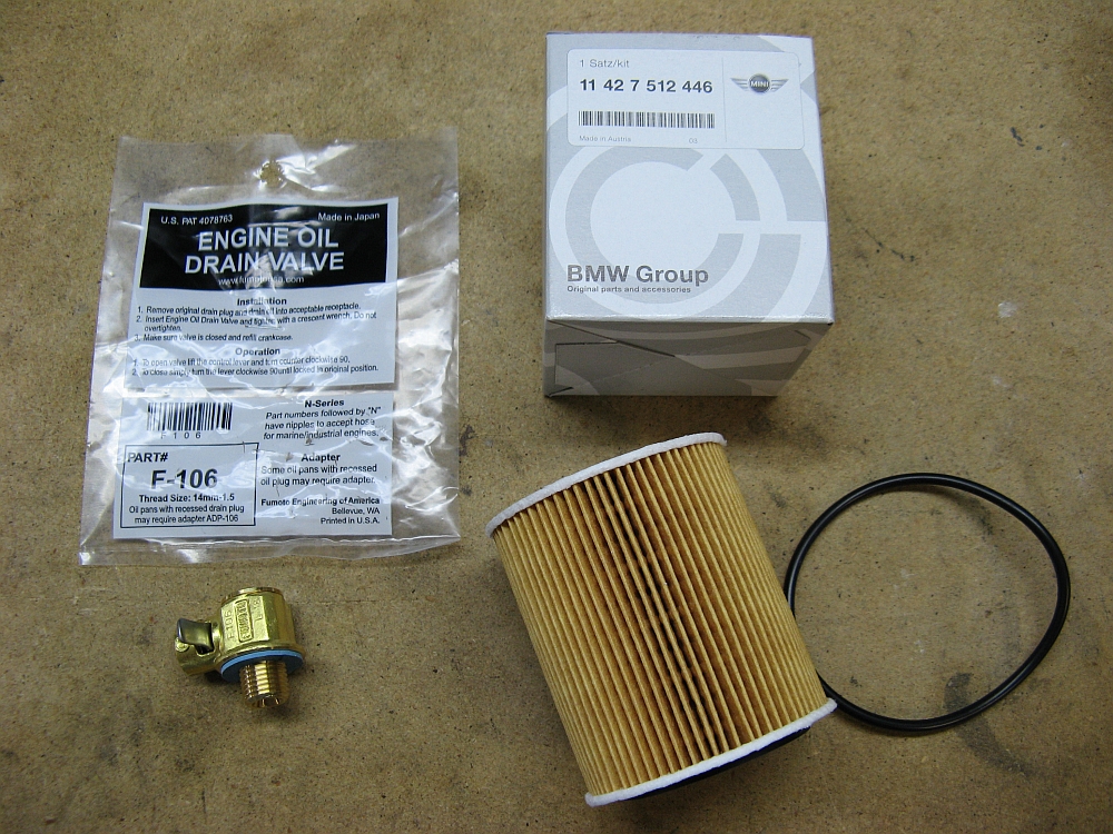 While installing both of the braces above I also changed the oil for my first time. In anticipation of this I had already purchased the BMW/Mini Oil Filter (P/N 11427512446) and a Fumoto Oil Drain Valve (P/N F-106) to replace the oil drain bolt. I also had some Amsoil 5w40 European Synthetic left over from my VW days and decided to use this for the Mini (BMW Synthetic 5w30, P/N 07510017866, is factory fill).