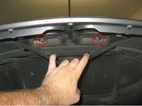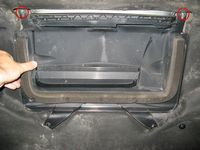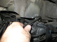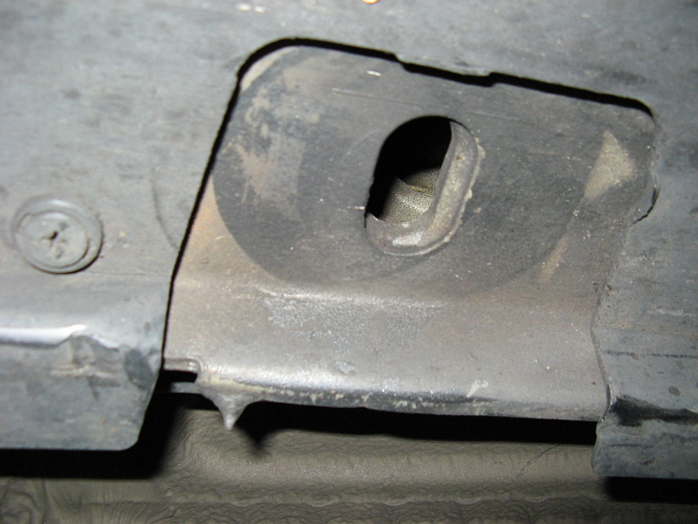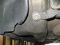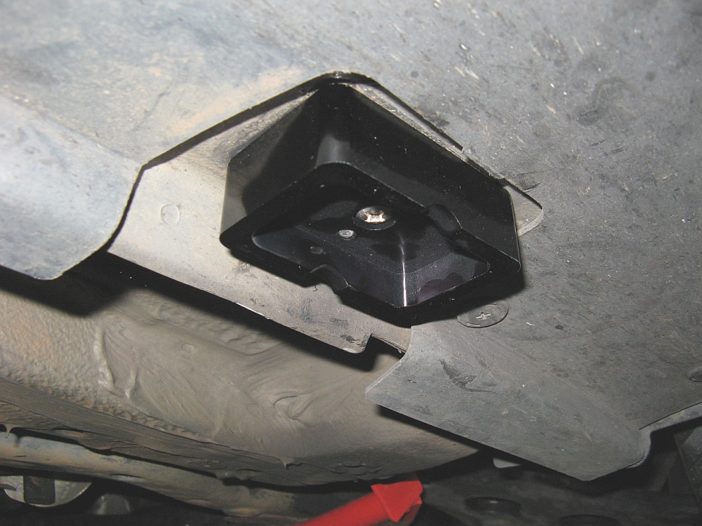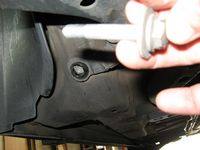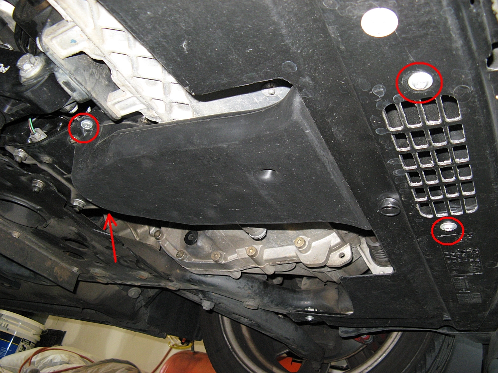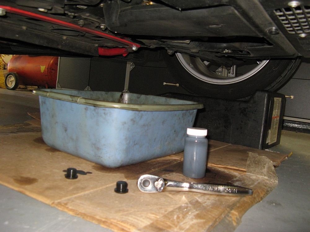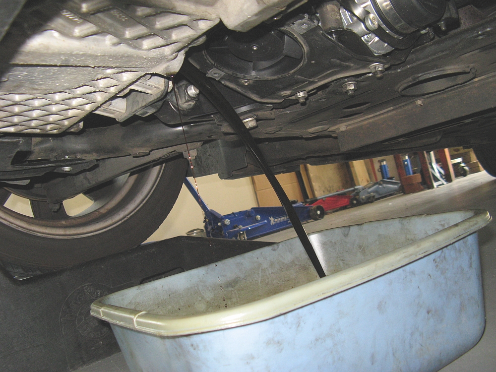 To start I took the car for a half hour drive to get the oil nice and warm- not only will it drain faster and more completely but the particulate that settles is now suspended in the oil when I drain it. After driving the car up on Rhino ramps and chocking the rear wheels, I removed the PSP fan duct using a Phillips head screwdriver to release the four screw retainers. With this out of the way I was able to access the oil drain bolt at the rear of the oil pan.