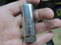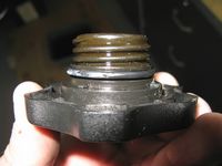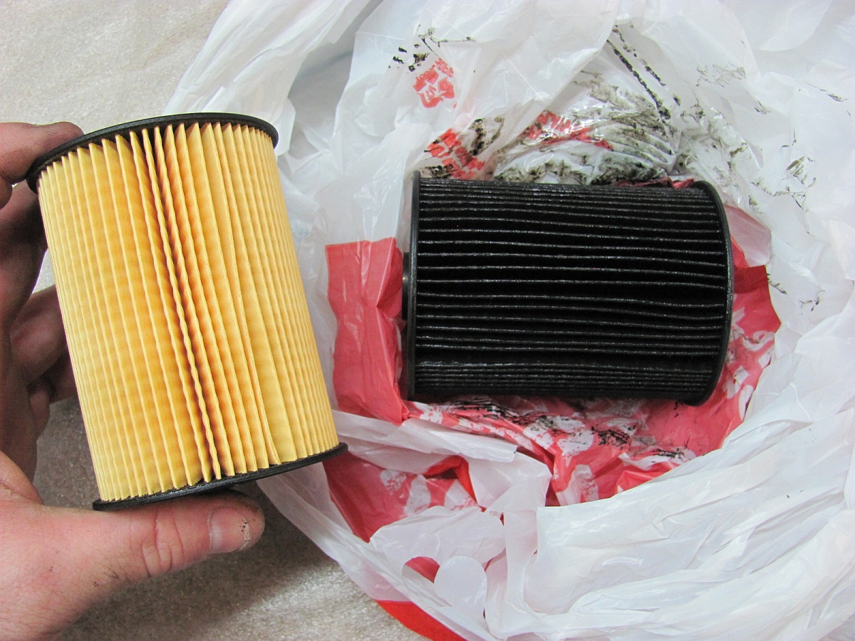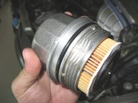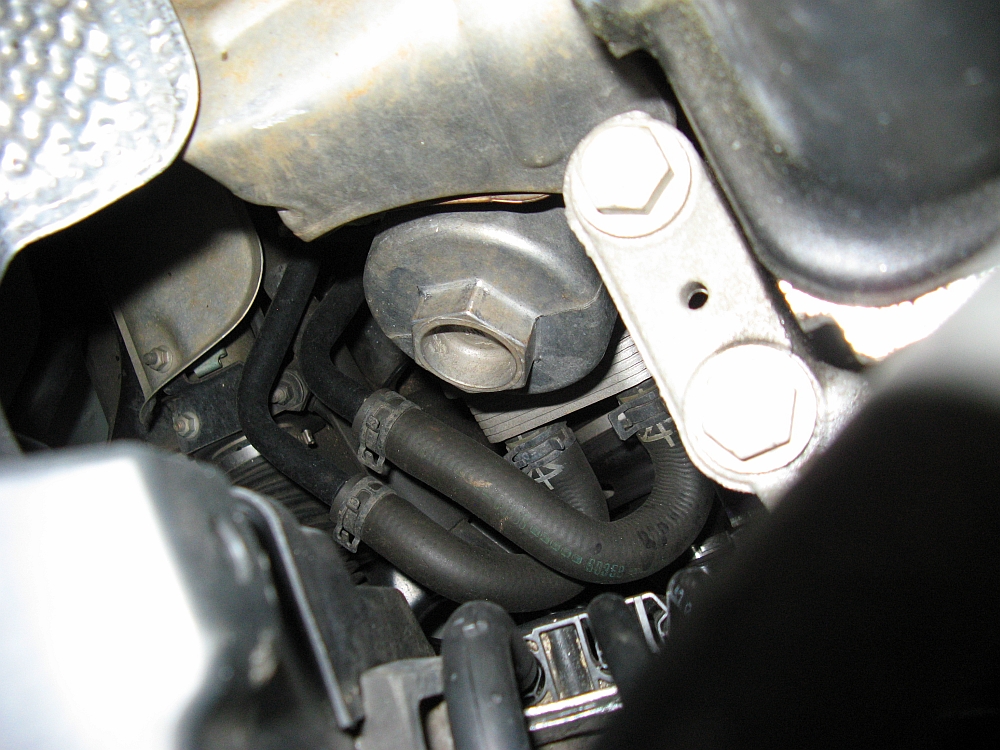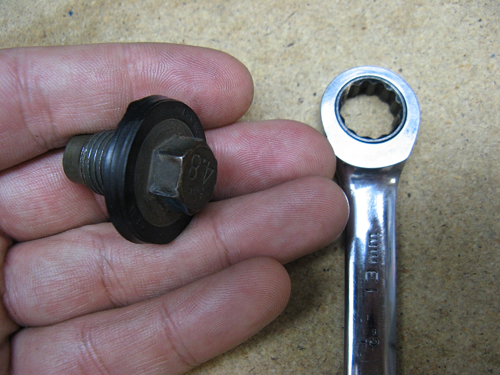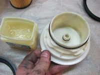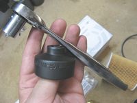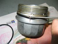 Placing a drain pan underneath, I removed the drain bolt using a 13mm wrench- the drain bolt and oil will be HOT so if you have some rubber gloves, that may protect your hand somewhat- please don't hold me responsible if you burn yourself. After most of the oil had drained, I moved to the top of the motor to loosen (but not yet remove) the oil filter canister lid using a short 36mm socket and a long 3/8" ratchet. Unscrewing this all the way out but letting it sit in the canister, I would say for 5-10 minutes, allows some more oil to drain out and makes less of a mess when you do remove it. It is tight and the motor is still HOT (be careful not to burn yourself), but the oil filter canister lid and oil filter can be removed by pulling out and straight up. Once out, the canister lid can be cleaned up and the new O-ring that came with the oil filter replaces the old one (don't forget to apply some new oil to the new o-ring, this will help it seat correctly when reinstalled in the housing and prevent it from getting stuck on next removal). The filter is pressed into place without the lid, rubber seal towards the motor or down, in the filter canister/housing on the motor to stretch the hole on that end, then removed and placed in the canister lid and pressed on to the center, again the rubber seal side of the filter should be outside the lid. The filter and canister lid are reinstalled, I recommend pushing the filter/lid assembly into place in the canister and hand starting to avoid cross threading, then hand tightening using the ratchet and 36mm socket.