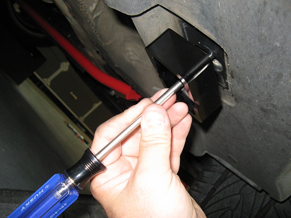The toggle nut is pinched and pushed through the mounting slot on the car. Tightening involves pulling the jack point down to apply pressure to the toggle nut while tightening the bolt with a Phillips head screwdriver. As the bolt is tightened make sure the outer HEX screws seat in the slot and hold the jack point square during final tightening. It is VERY easy to strip out the toggle nut so get it tight enough that the jack point will not twist but not gorilla tight. Repeat for remaining jack points.