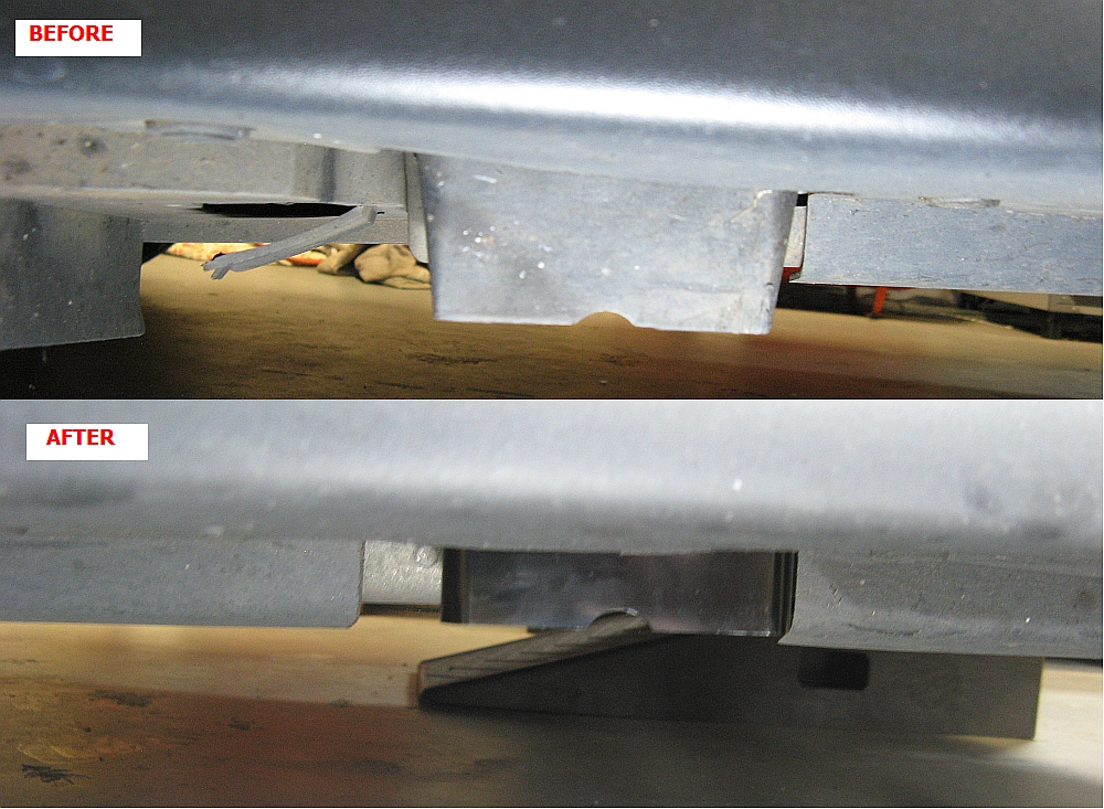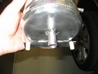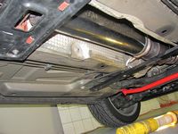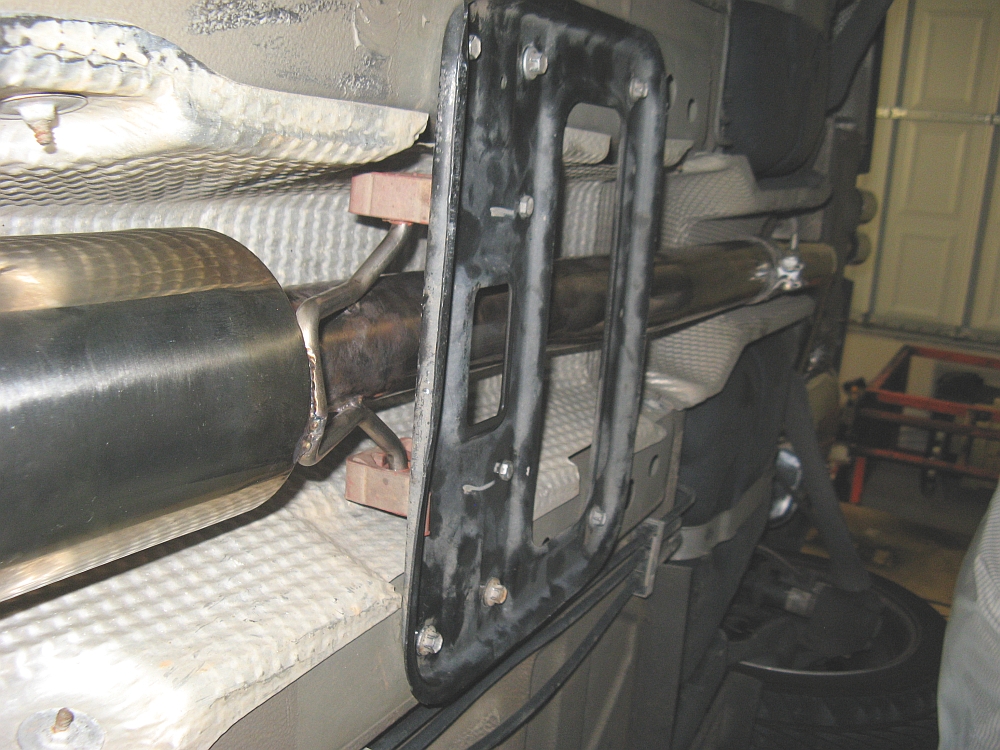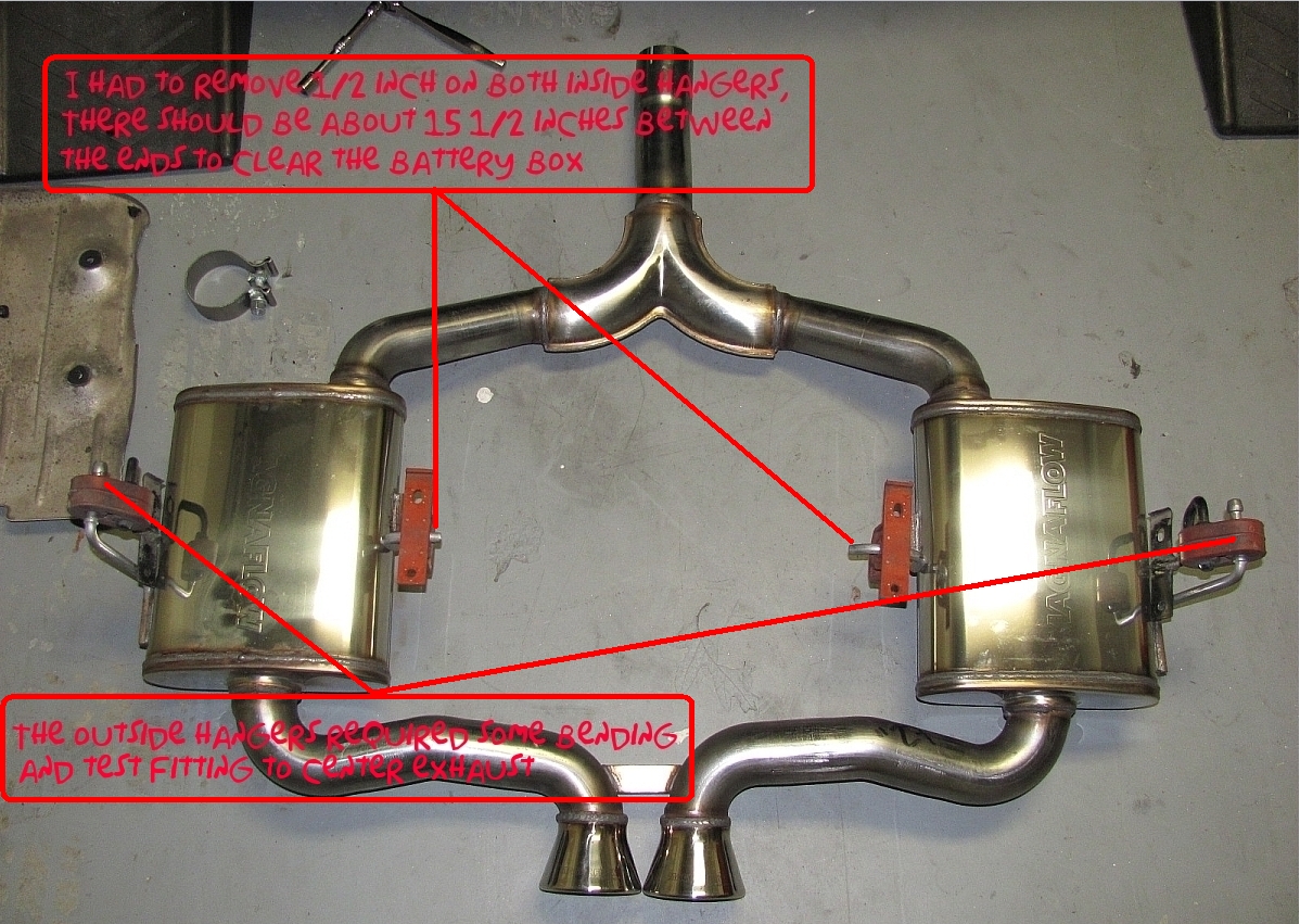 It did require some fitting: I used my die grinder/cutoff wheel to remove about 1/2" of the inside hangar rods so they would clear the battery box (measures about 15.5" tip to tip to clear the heat shield around the battery box, the outside hangars required some bending and test fitting to get the exhaust centered, and I had to use some 5/8" washers to shim the hangers down so that the tips were not touching the valance. I also decided I wasn't happy with the rubber vacuum plug on the end of the resonator hanger rod on the driver side and used a hack saw to trim it down about 1/2" so it would not contact the heat shield. But after the adjustments, the tips are perfectly centered and do not touch the valance, about 1/4" clearance at the top and more on the sides. Pictures below highlight some of these adjustments.