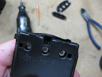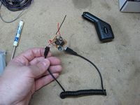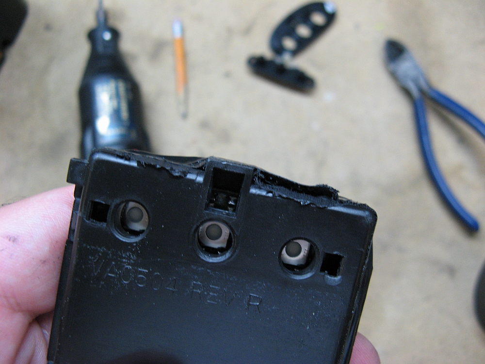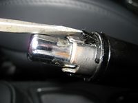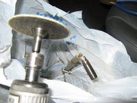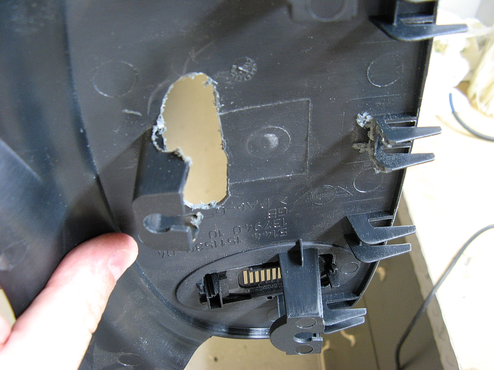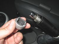 The cigarette lighter plug was disassembled and the wires cut from the contacts- I then extended the 12v+ and ground wires so I could wire them in with the gauges. The lighter plug casing can be cleaned out and reinstalled over the circuit board, feeding the wires out of the + contact hole. I removed the trim around the speedo and vents and made a small hole with a Dremel tool and routed the wire and plug around the vent and out of the hole.