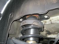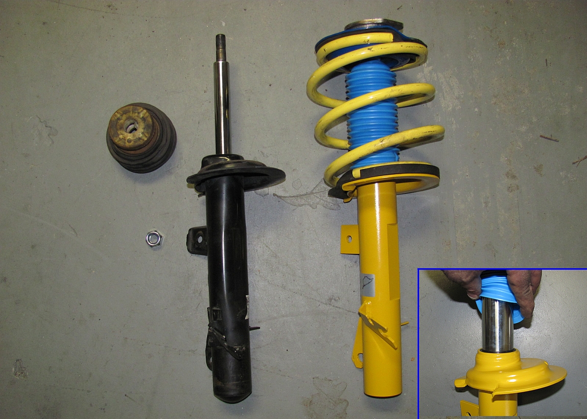 The front struts are an inverted design and use an internal bumpstop so the OE bump stop is not used. I did have to reuse the OE nut since the Bilstein supplied nut was larger and I could not get a socket down in the Hotchkis camber plate bearing holder to tighten. The rear shocks came with new bump stops.