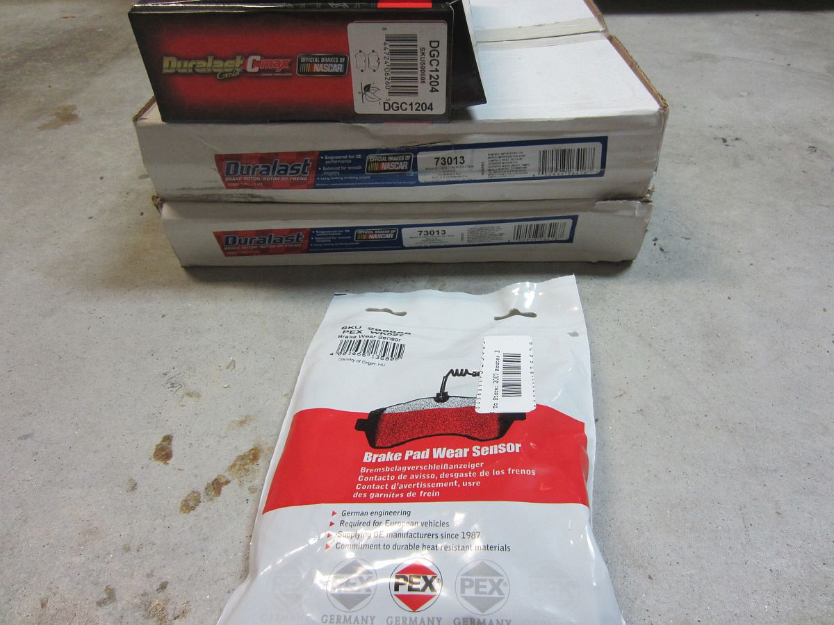 Time for front brake pads and rotors. Duralast Ceramic Pads (P/N DGC1204), Duralast Rotors (P/N 73013), and PEX Brake Pad Wear Sensor (P/N WK527) used as replacement parts for my JCW brakes.
