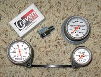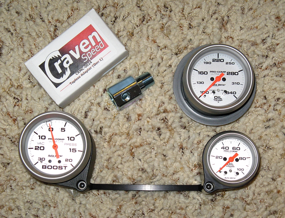 Cravenspeed X Mount/52mm Gauge Pods/Oil Pressure Sensor Adapter CRMC-0024 and Autometer Gauges (Boost 4377, Oil Pressure 4353) installed. I started out with the larger 2 5/8" mechanical boost gauge (Autometer 4401) but decided I didn't like it after a week and replaced it with the electric gauge. The oil temp gauge and vent mount are still a pending project.