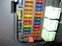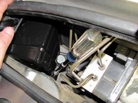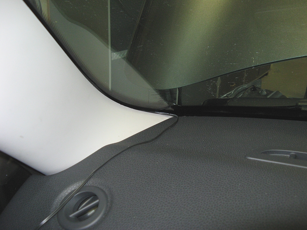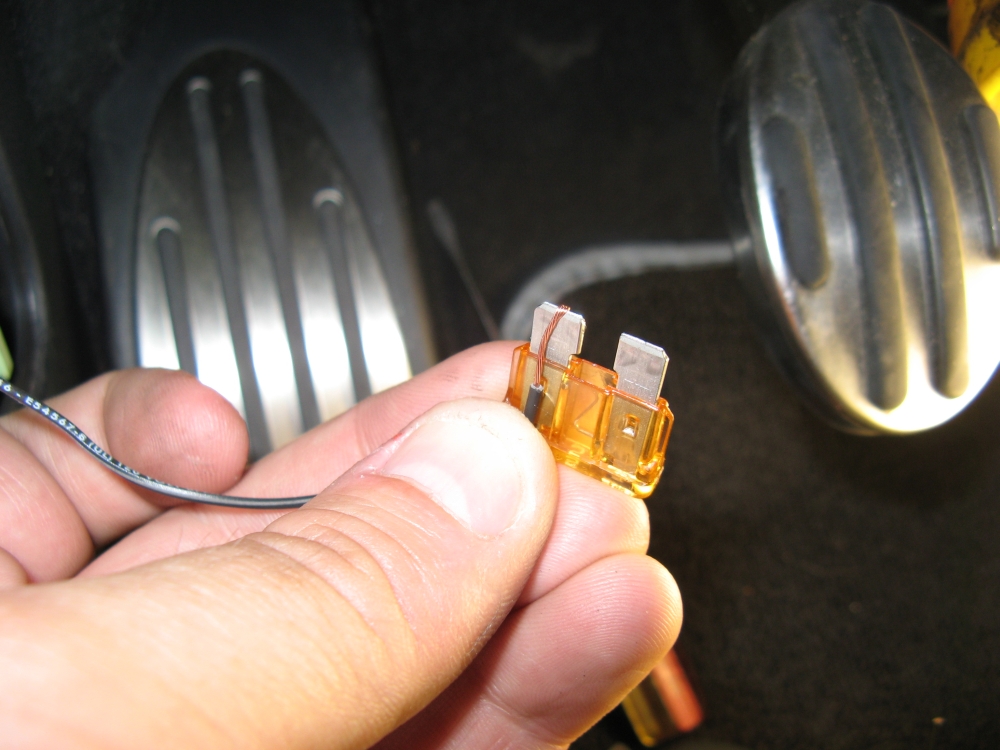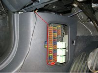 The power wire is run from the detector, across the top windshield trim, around and down the front of the a-pillar piece, and finally down to the fusebox tucking the wire behind and between trim pieces as I went. Since the wire was not fused, I used a volt/ohm meter to find that the left side of the fuse is the 12v side- I wrapped the 12v+ wire around the right spade of the fuse and plugged it back into the fusebox (this is what we did before someone invented fusetaps). Now the detector shares the same fused circuit as the defroster (lowest right corner 5A fuse looking at the fusebox). The ground wire was tucked under a bolt under the driver side access panel on the way down to the fusebox. This fuse position only powers the detector when the car is running and not when key is just in the accessory position.