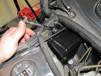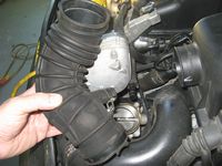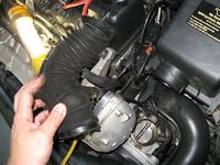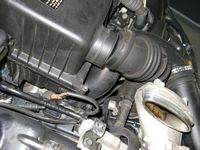 There are two Torx head screws that hold the airbox lid on, after these are removed (and the battery wire holder also pulled up/out and to the side) the lid is tilted back/up and removed. The old filter lifts up and out. This is a good opportunity to use a shop vac to get all of the dirt/leaves/debris out of the airbox before installing the new filter and the airbox lid. When installing the new intake hose I found that the smallest hose with new supplied clamp could be installed first, and then the lower clamp- both of these bolts are easily reached and tightened with a ratchet/socket with the IC removed. The upper part of the hose did not line up perfectly with the airbox so I held it in place while tightening the upper clamp.