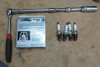 I needed a new upper motor mount to replace the failed/leaking OE oil filled mount, I knew this when I bought and made the deal on the car. In the search for a new mount, I came across the TSW Upper Motor Mount made of "Street" durometer poly and no oil to leak out and cause the mount to fail. These are the kind of parts I like to upgrade to when replacing OE, parts that will last longer and/or provide better performance. I found Way's business online when trying to locate a local Mini business that stocked these, I stopped by his place on the way in from out of town. Way is a great guy to talk to and knowledgeable when it comes to Minis- he races them so he knows a thing or two. I also bought his WMW Pulley Package which included a WMW 15% Pulley, NAPA Belt (P/N 060535-smaller for the new pulley), Colder Heat Range Plugs (NGK P/N BKR7EQUP replacing stock NGK BKR6EQUP, same as JCW), and a Detroit Tuned Tensioner Stop. I picked up a belt tool (to release tension in the tensioner to change the belt) and some Powerflex poly bushings (P/N 103-950) for the belt tensioner damper. I figured since I had to jack the motor up to install the new mount I should go ahead and do the pulley and associated parts installation at the same time