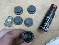 I finally got fed up with the OE wheel lock plastic caps. I used some old VW black paint to paint the center of the lock so it blends in without caps.