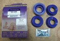 Powerflex Front Control Arm Bushings [FCABs] (P/N PFF5-101), Front R53 SwayBar Bushings (P/N PFF5-102-24), and Steering Rack Bushing (P/N PFF5-102-24) from Way Motor Works installed. I had purchased new Lemfoerder (OEM) front inner/outer control arm ball joints from Pelican Parts some time ago when they were on sale and I had a credit, but these can also be purchased from Way as part of his FCAB kit. If you are going to drop or lower the subframe for the control arm bushings you might as well do the rest while you're there.