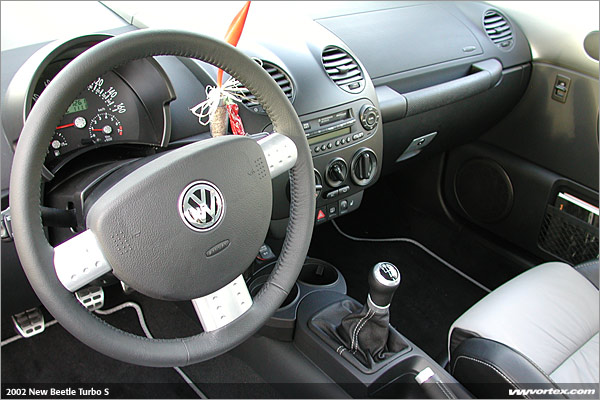 The New Beetle Turbo S has a number of exterior and interior changes to let people know this is a slightly different Beetle as well. Outside Volkswagen has created a new version of the German Votex body kit with an all-new front bumper replacement that is reminiscent of New Beetle Cup racecars, new turn signals located inboard of the headlamps, integrated front foglamps, newly designed rear bumper fascia with exposed dual chrome tipped exhaust and special Turbo S badging on the rear hatch. Also exclusive to this model is the new 'Delta X' 17" alloy wheel with 225/45HR-17 tires. Opinions of the new wheel design at the press launch were either love it or hate it with overall more people liking it. The automatic roof spoiler common to turbo New Beetle models now deploys at speeds higher than 45mph (as opposed to the original 95mph) and lowers when the vehicle goes below 10mph. Overall the car really looks great going down the road with great little details that stand out more than you would think. On the interior, Volkswagen has also made a number of changes that look great. First are the newly redesigned 'sport' seats that are a running change not only on this car, but on the GTI and forthcoming Jetta GLI in the future. This seat has great thigh and side bolster support and really hugs the driver in place even covered in leather - a HUGE improvement over the extremely flat stock New Beetle seats. The Turbo S model sport seats are black leather with unique silver/grey leather inserts and silver/grey stitching. This same silver stitching is also found on the black leather shift boot that is topped off with a great looking brushed aluminum trimmed shift knob. Other brushed aluminum accents include the door pull handles, door lock sticks, glove box handle, three spokes of the steering wheel and around the top of the flower vase. To finish it off, brushed stainless steel pedals with rubber inserts from the Audi TT tie everything together and make for a very sporty look in the interior.