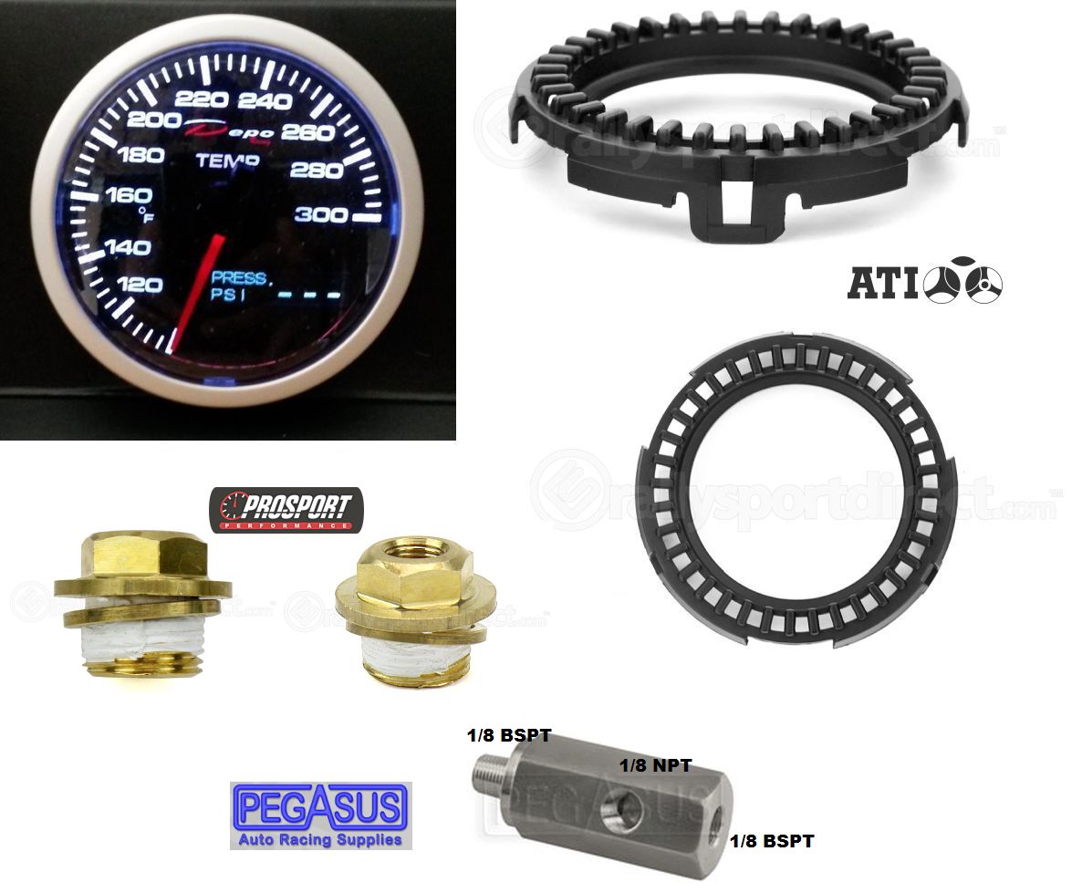 NOTE: The Subaru OEM Oil Galley Plug is threaded for 1/8 BSPT senders and DOES NOT WORK for 1/8 NPT senders.Pegasus Pressure Gauge Adapter, 1/8 BSP Male & Female, 1/8 NPT Female Tee for the new oil pressure sender and retention of the existing OE sender, ATI Vent Pod 60mm (P/N ATI VPOD-72)