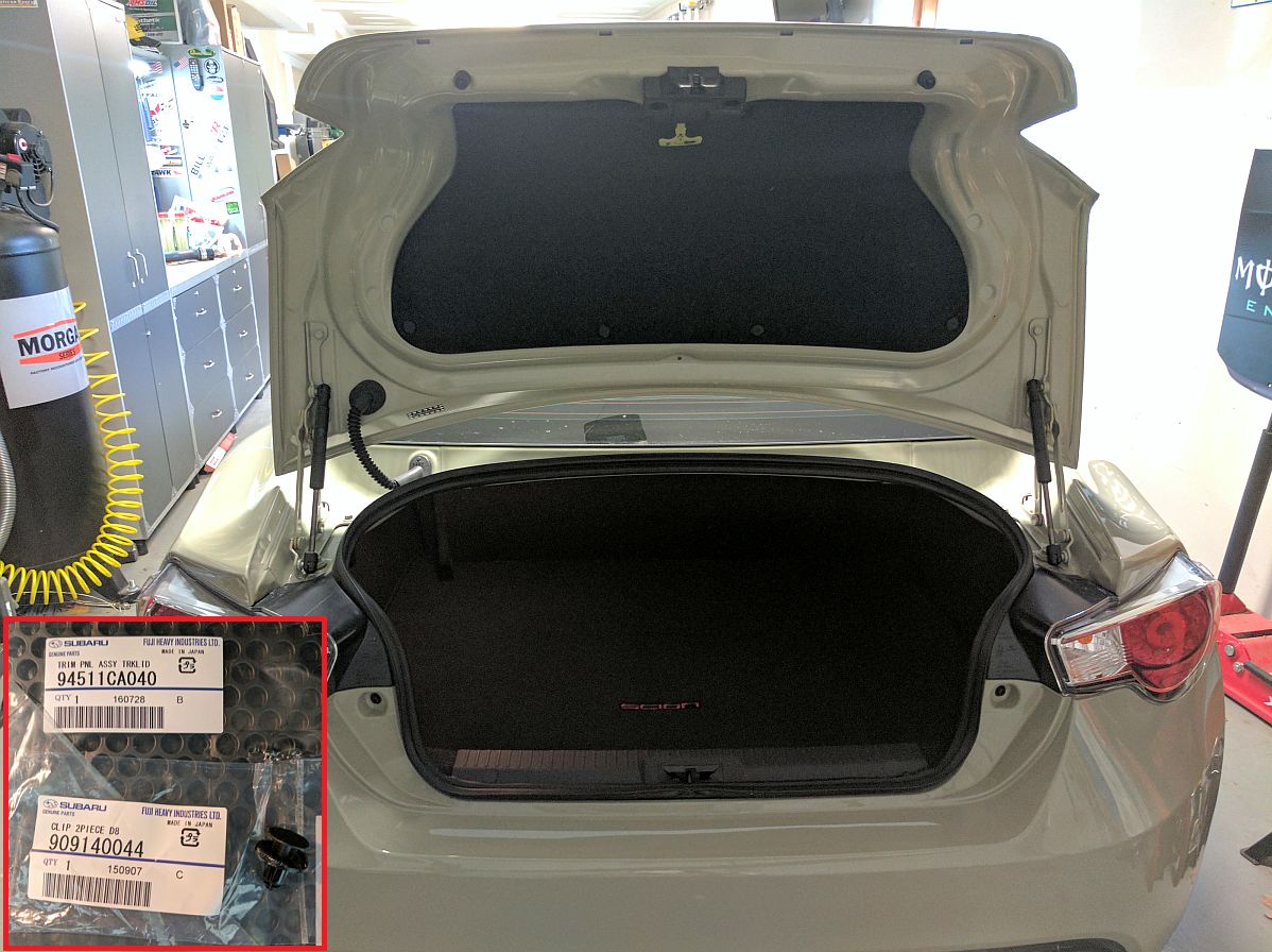 86 Speed Frameless Mirror Installation Video HERE may help...forum threads HERE and HERE.- Subaru BRZ Trim Panel-Trunk Lid (P/N 94511CA040)