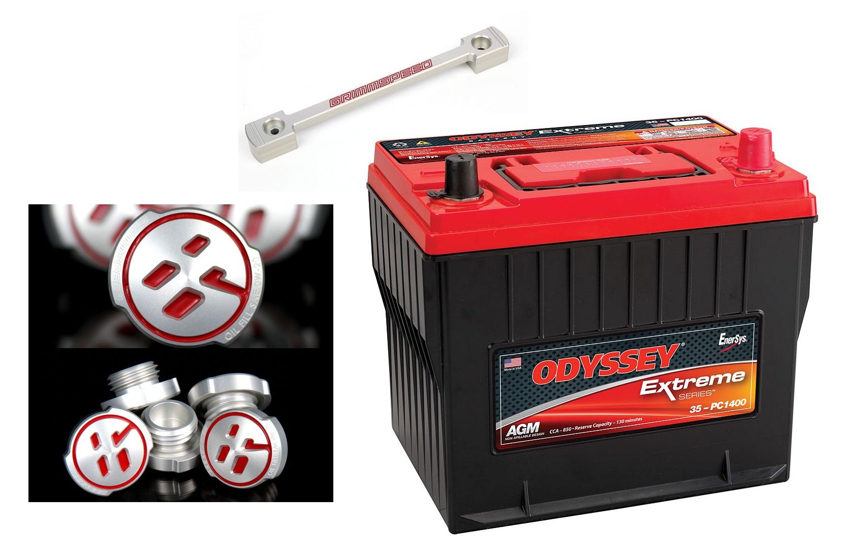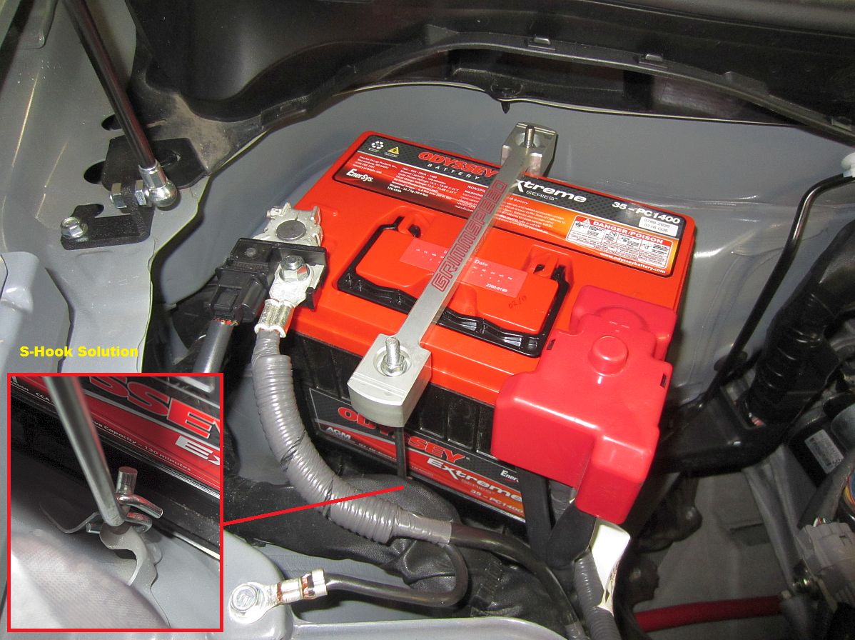 Warning, the GrimmSpeed battery tie down may/may not work with the OE battery, it definitely doesn't work with the Odyssey- the front J-Hook is a bit too short. Your mileage may vary but I was able to use a small S-Hook from Home Depot that lengthened the J-Hook enough to work.....time will tell if this is a viable long-term solution.