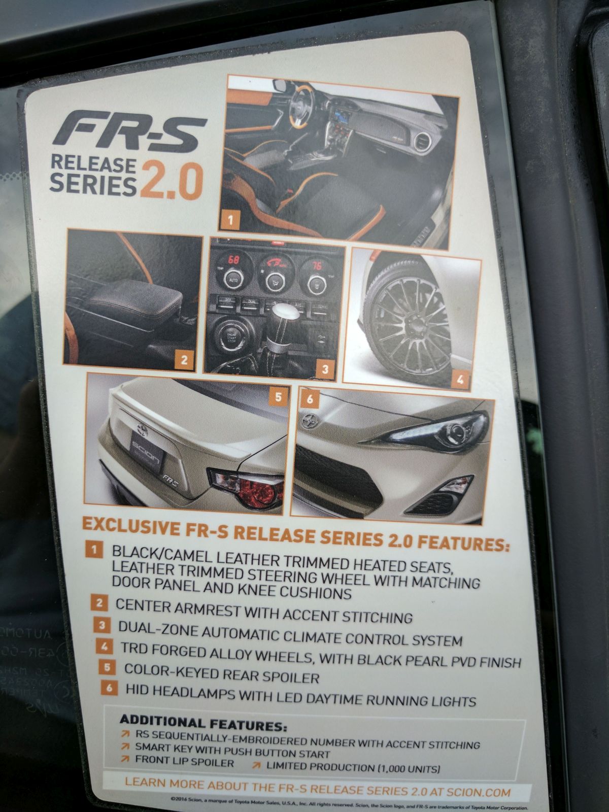 FT86 FRS Release Series 2.0 Registry HERE. RS 2.0 specific front spoiler is P/N PZ321-18004, wheels are P/N PTR20-18160-BK.